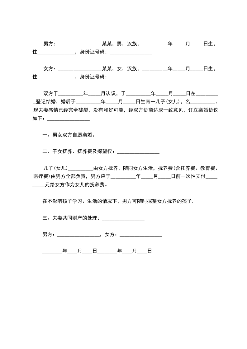 双方于__________年_____月认识,于__________年_____月_____日在__________登记结婚,婚后于__________年_____月_____日生育一儿子(女儿),名__________。现夫妻感情已经完全破裂,没有和好可能,经双方协商达成一致意见,订立离婚协议如下:_________________