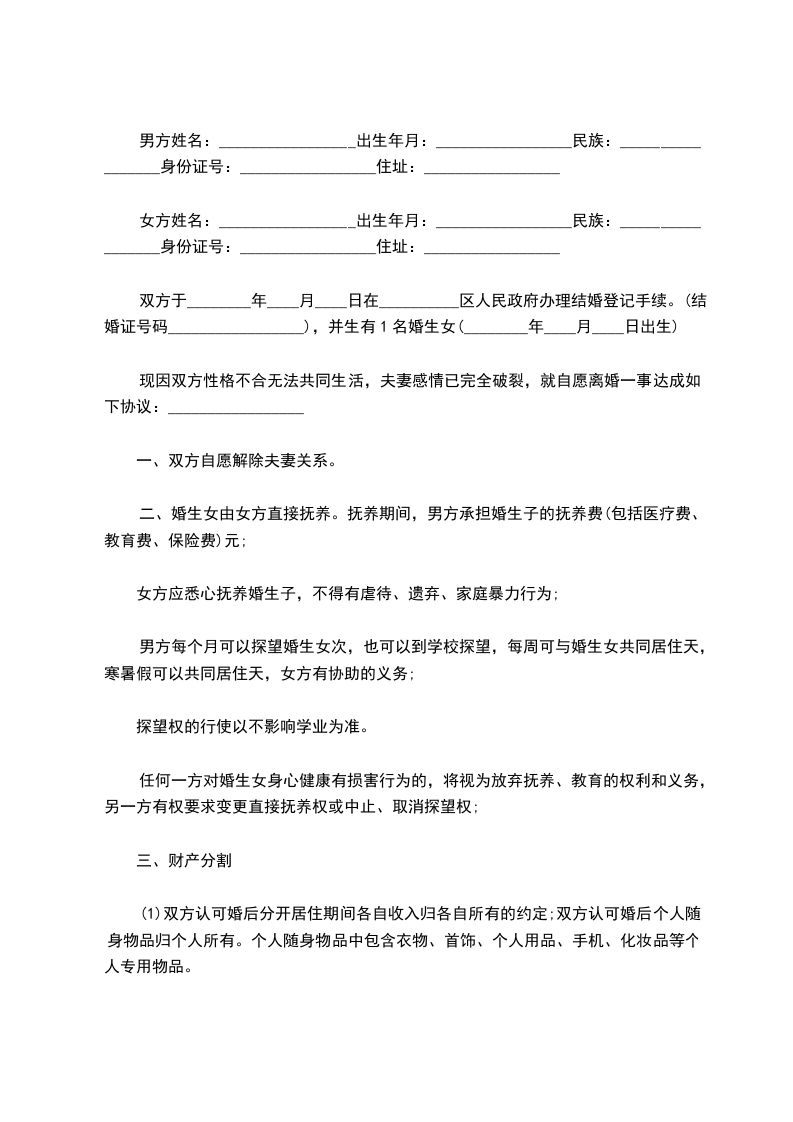 女方姓名:_________________出生年月:_________________民族:_________________身份证号:_________________住址:_________________