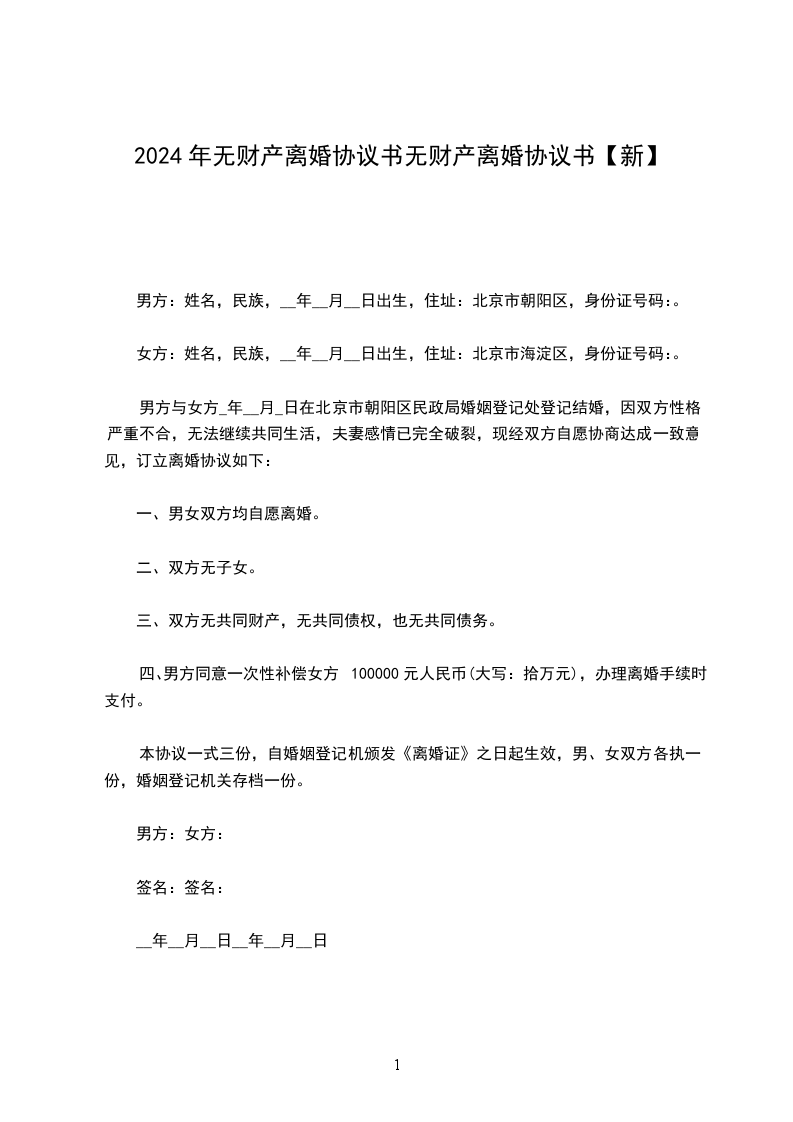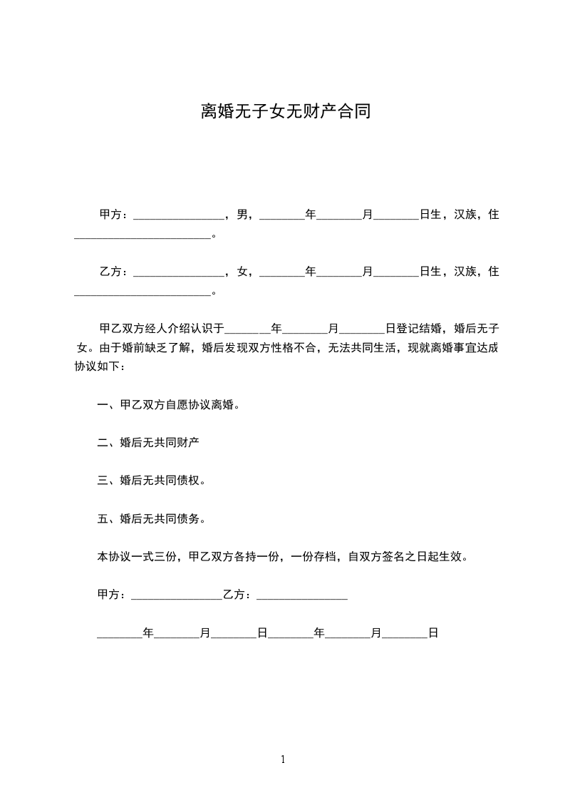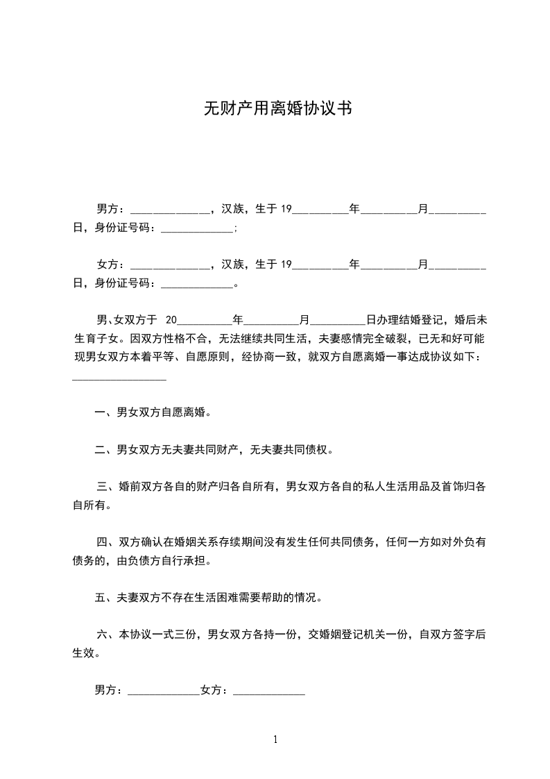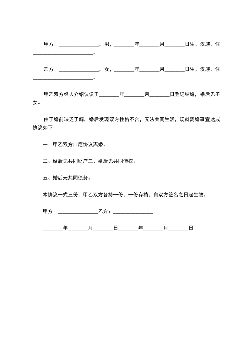 男、女双方于20__________年__________月__________日办理结婚登记,婚后未生育子女。因双方性格不合,无法继续共同生活,夫妻感情完全破裂,已无和好可能。现男女双方本着平等、自愿原则,经协商一致,就双方自愿离婚一事达成协议如下:_________________