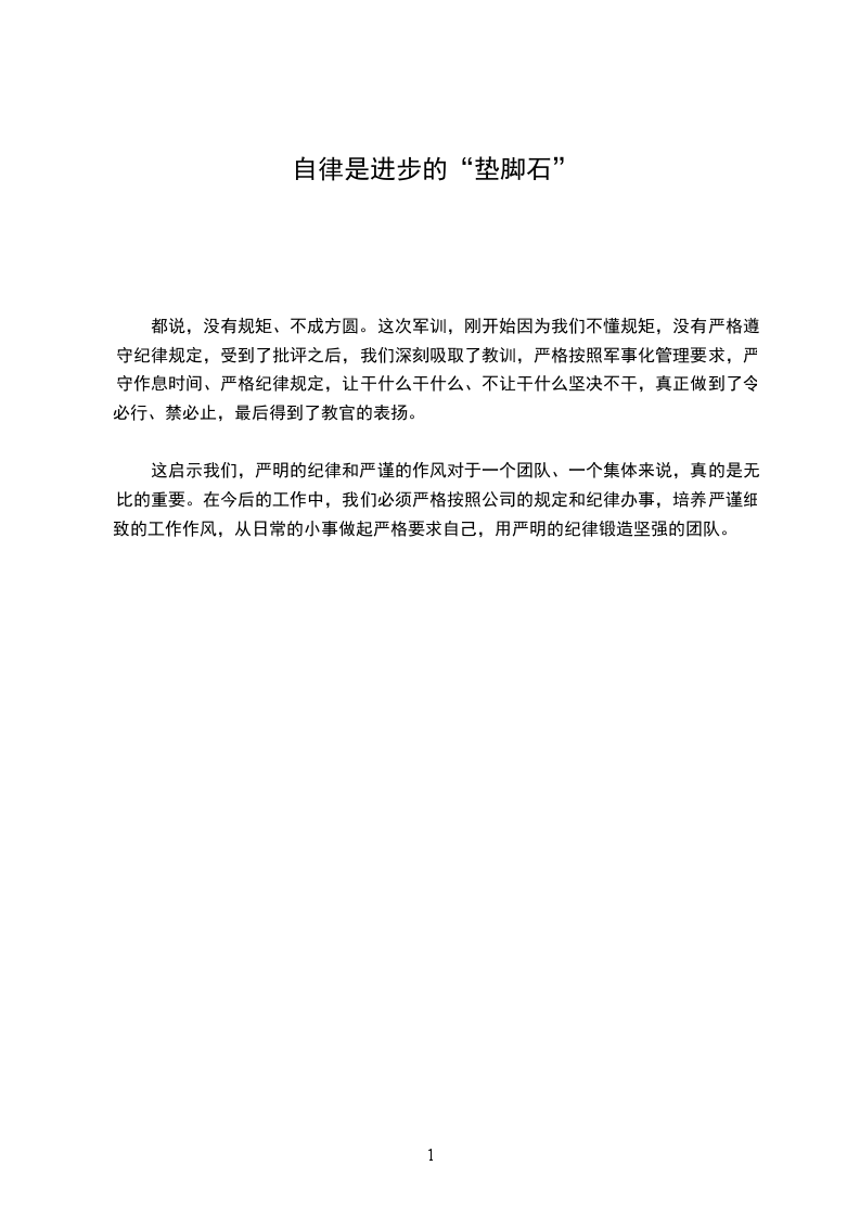都说,没有规矩、不成方圆。这次军训,刚开始因为我们不懂规矩,没有严格遵守纪律规定,受到了批评之后,我们深刻吸取了教训,严格按照军事化管理要求,严守作息时间、严格纪律规定,让干什么干什么、不让干什么坚决不干,真正做到了令必行、禁必止,最后得到了教官的表扬。