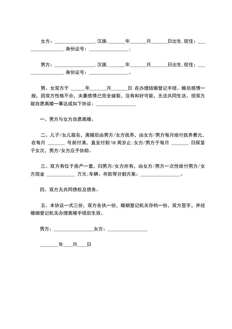 男、女双方于 ______年_______月_______日 在办理结婚登记手续。婚后感情一般,因双方性格不合,夫妻感情已完全破裂,没有和好可能,无法共同生活。现双方就自愿离婚一事达成如下协议:_________________