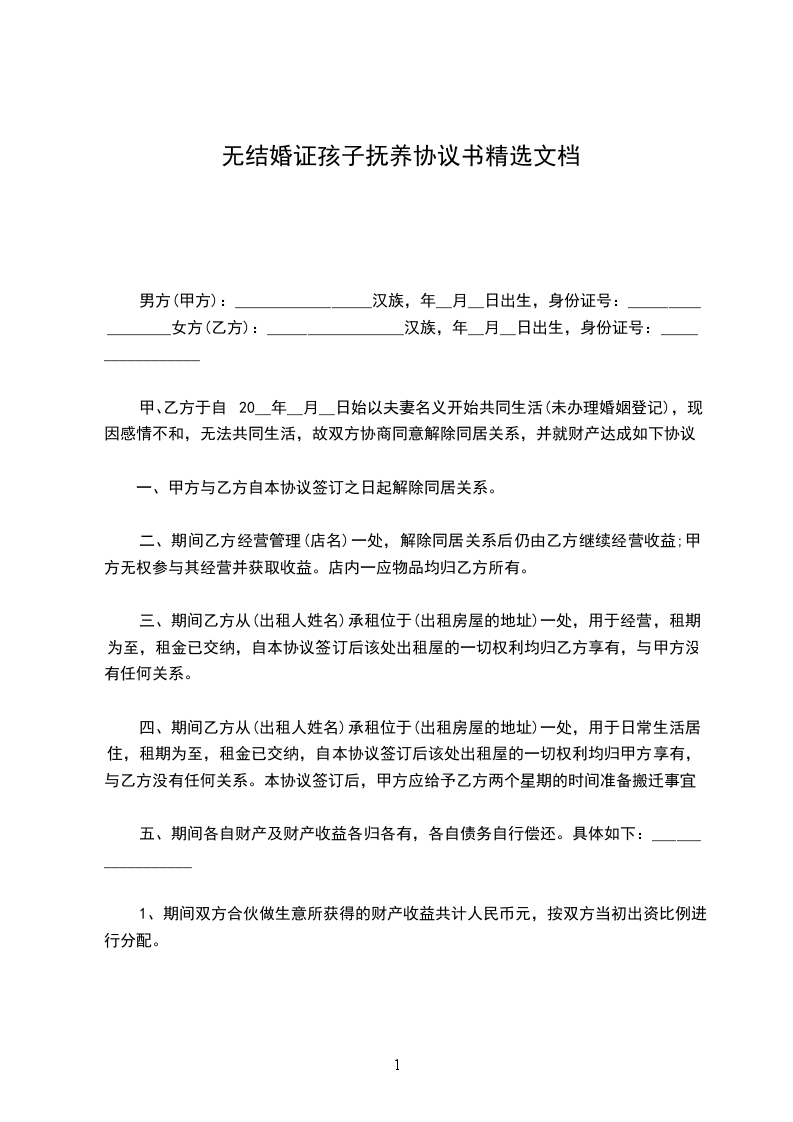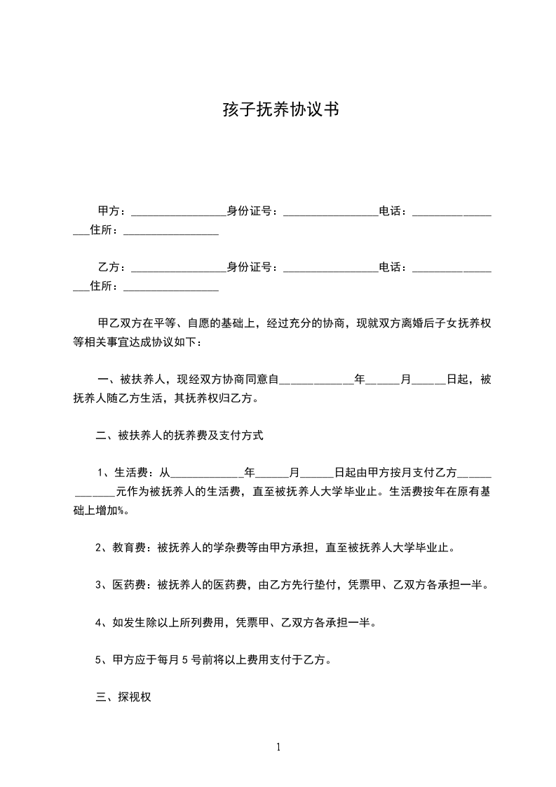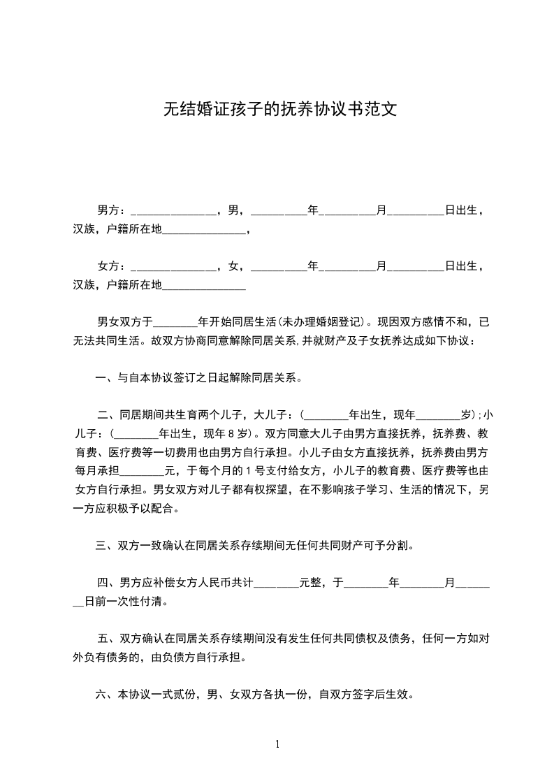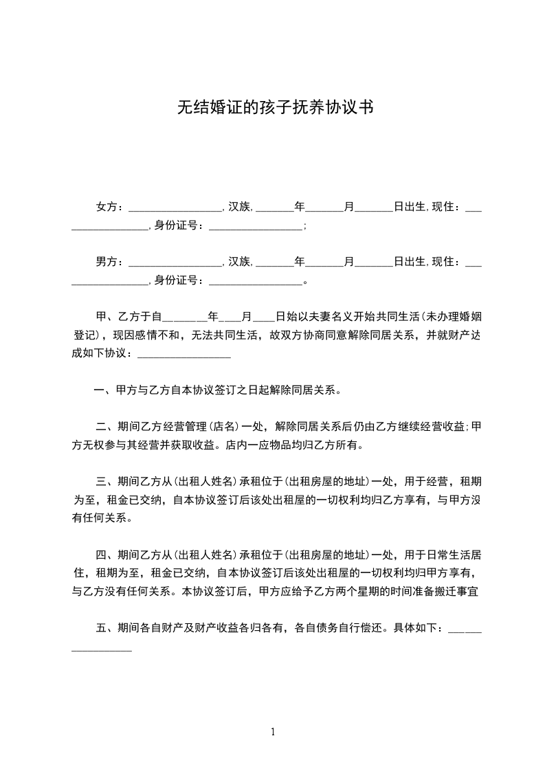 七、儿/女----生于----年--月--日,解除同居关系后归----抚养,----不负担儿/女抚养费,儿/女依法对外承担的法律责任、大额医疗费等任何费用均由----独自承担。----享有探视儿/女的权利,--不得借故阻挠。