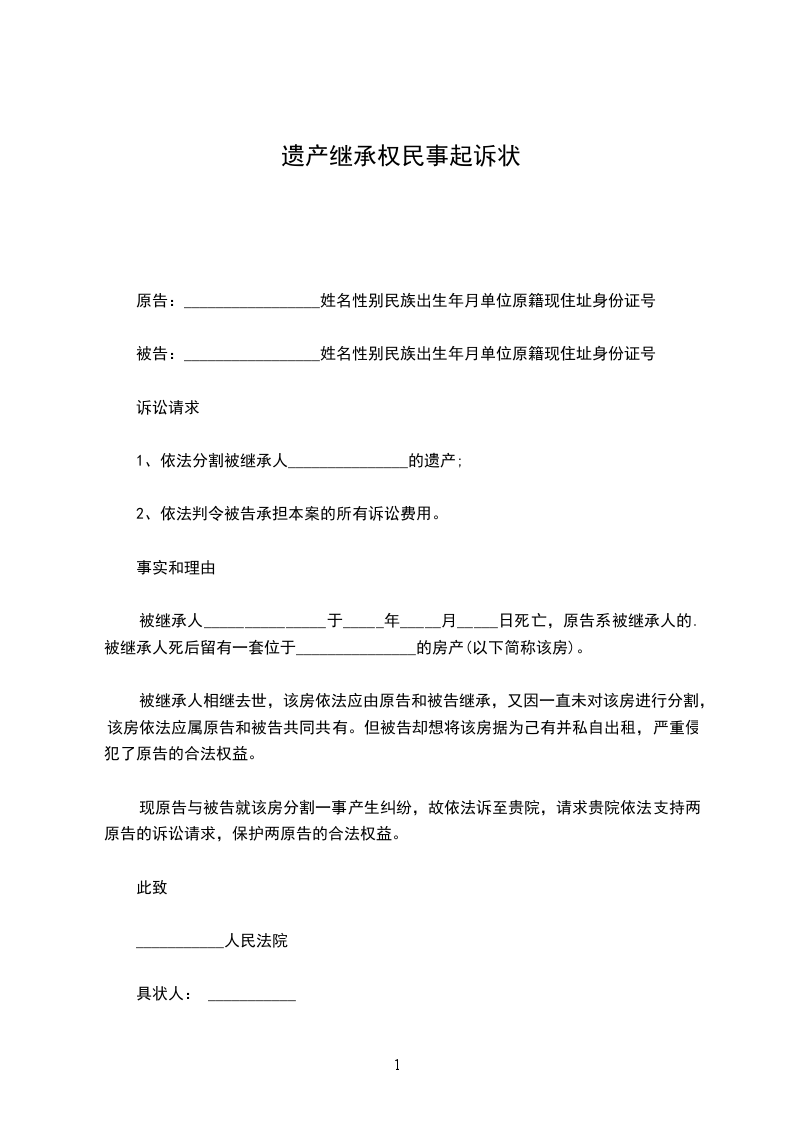 被继承人_______________于_____年_____月_____日死亡,原告系被继承人的.被继承人死后留有一套位于_______________的房产(以下简称该房)。
