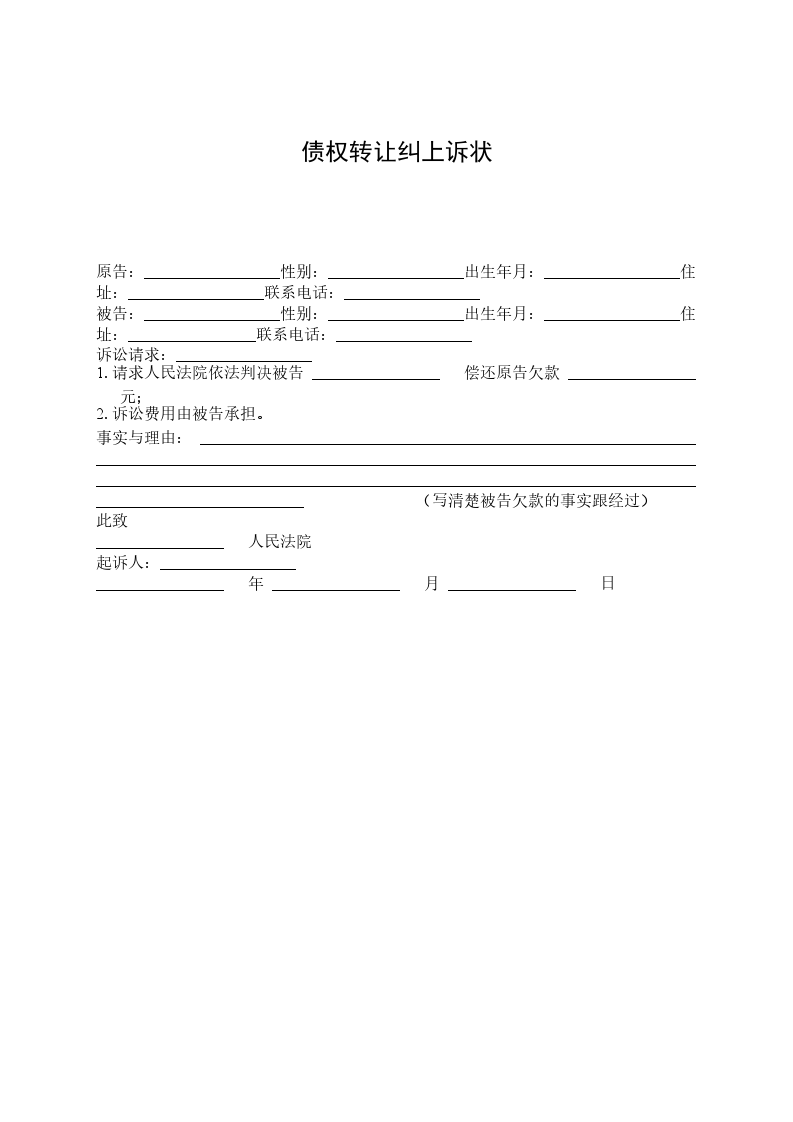原告:_________________性别:_________________出生年月:_________________住址:_________________联系电话:_________________ 被告:_________________性别:_________________出生年月:_________________住址:________________联系电话:_________________ 诉讼请求:_________________ 1.请求人民法院依法判决被告 ________________ 偿还原告欠款 ________________ 元; 2.诉讼费用由被告承担。 事实与理由: ______________________________________________________________________________________________________________________________________________________________________________________________________________________________________________ (写清楚被告欠款的事实跟经过) 此致 ________________ 人民法院 起诉人:_________________ ________________ 年 ________________ 月 ________________ 日