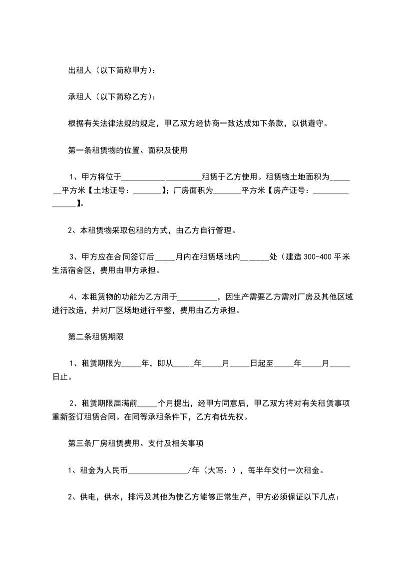 1、甲方将位于____________________租赁于乙方使用。租赁物土地面积为_______平方米【土地证号:_______】;厂房面积为_______平方米【房产证号:_______________】。