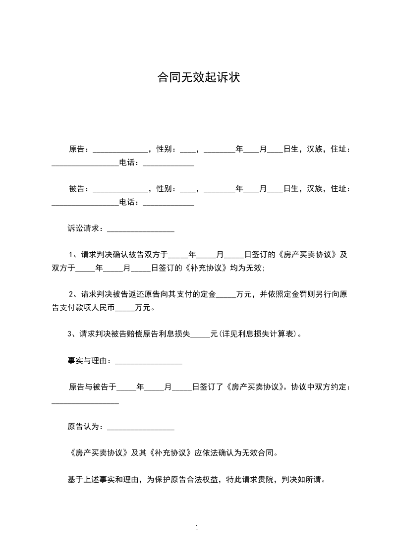 1、请求判决确认被告双方于_____年_____月_____日签订的《房产买卖协议》及双方于_____年_____月_____日签订的《补充协议》均为无效;