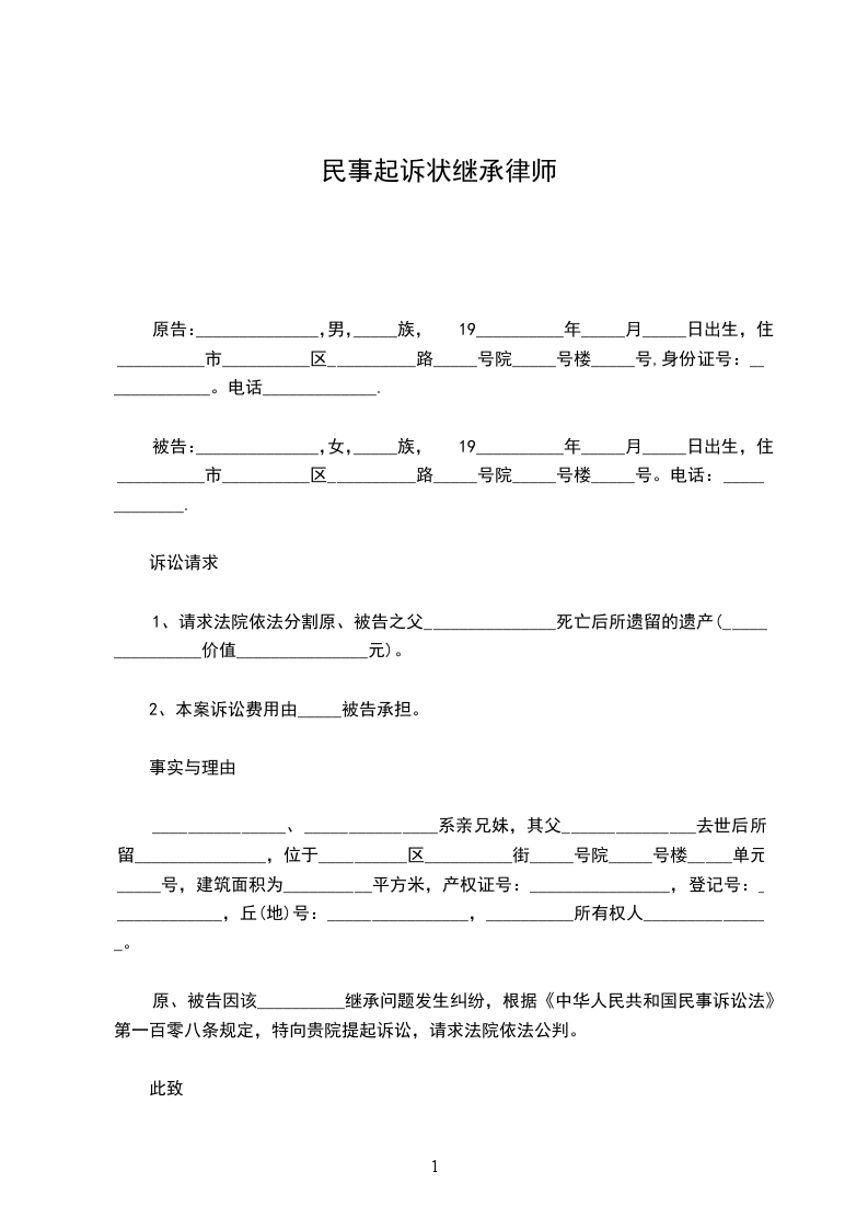 原、被告因该__________继承问题发生纠纷,根据《中华人民共和国民事诉讼法》第一百零八条规定,特向贵院提起诉讼,请求法院依法公判。