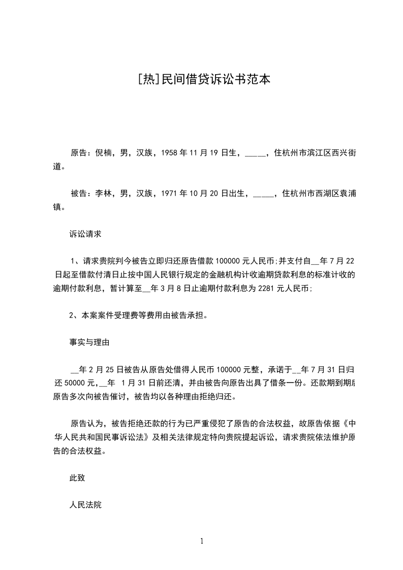 被告:______________,女,_____族,19__________年_____月_____日出生,住__________市__________区__________路_____号院_____号楼_____号。电话:_____________.