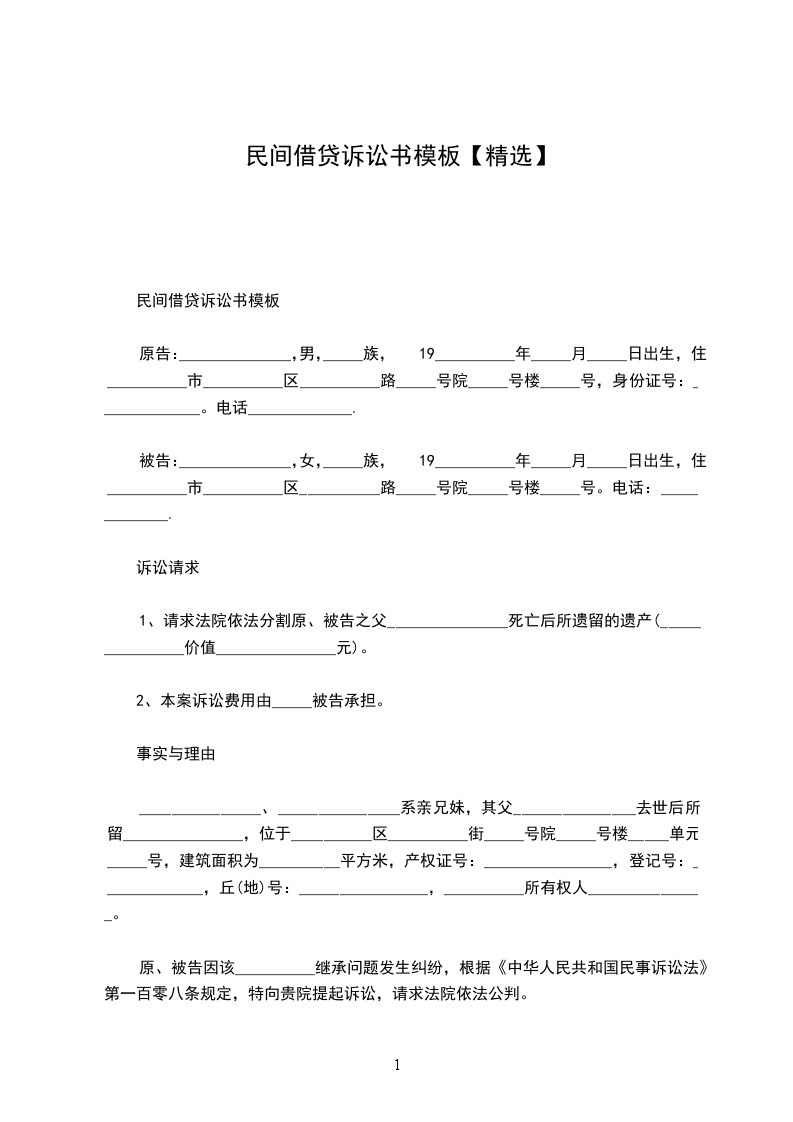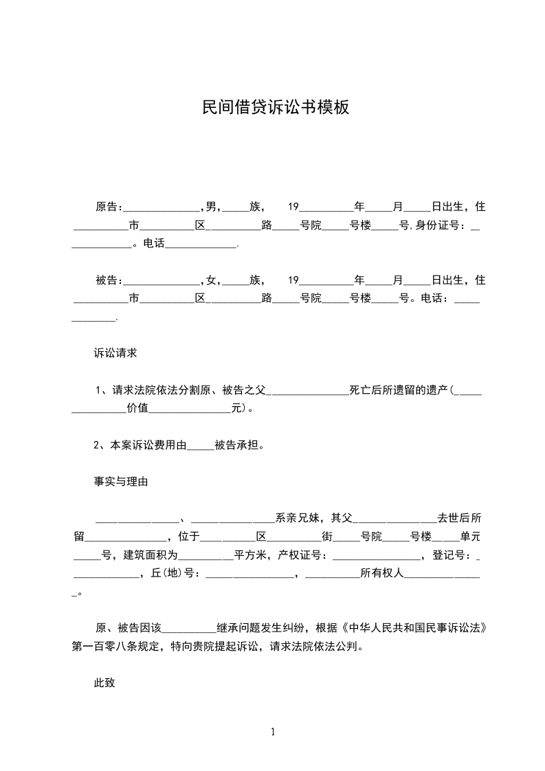 1、请求法院依法分割原、被告之父_______________死亡后所遗留的遗产(_______________价值_______________元)。