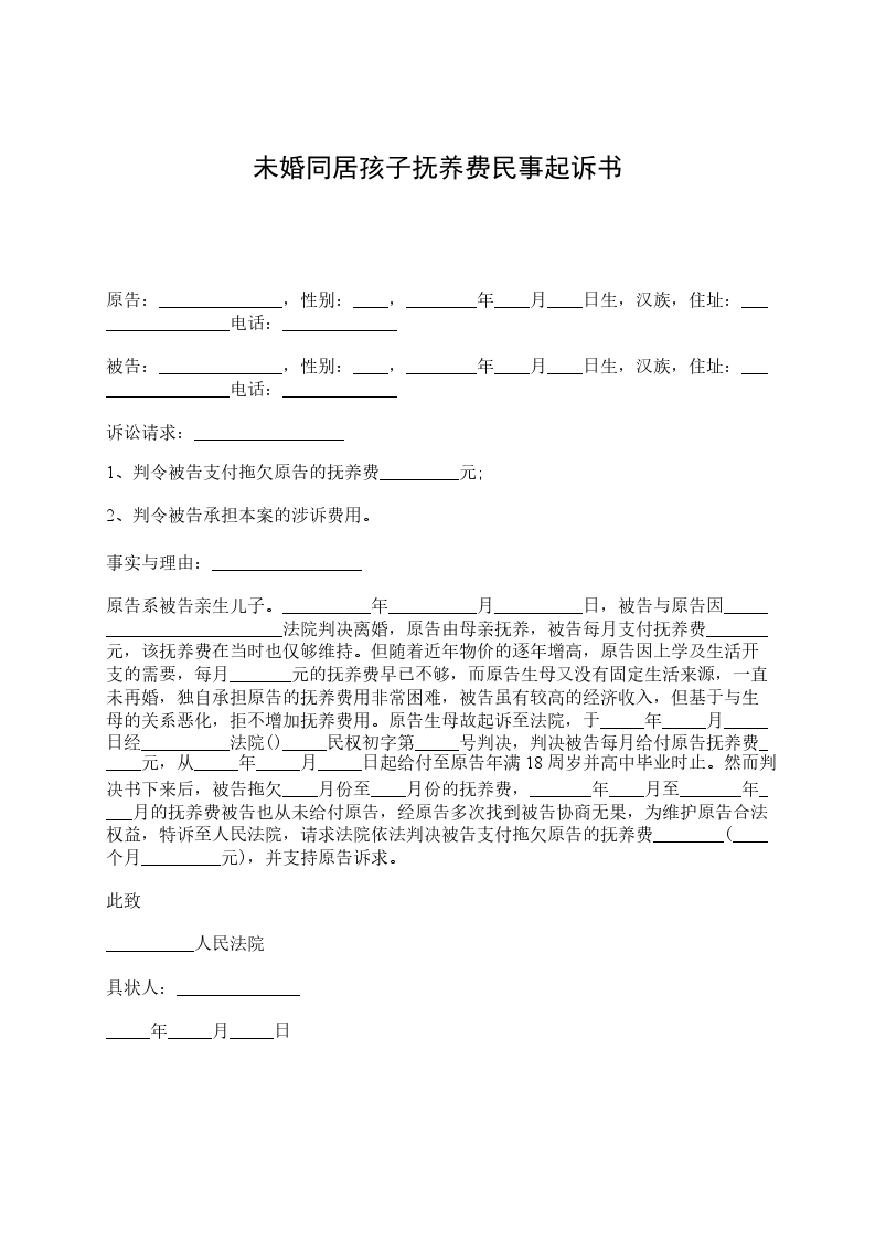 未婚同居孩子抚养费民事起诉书