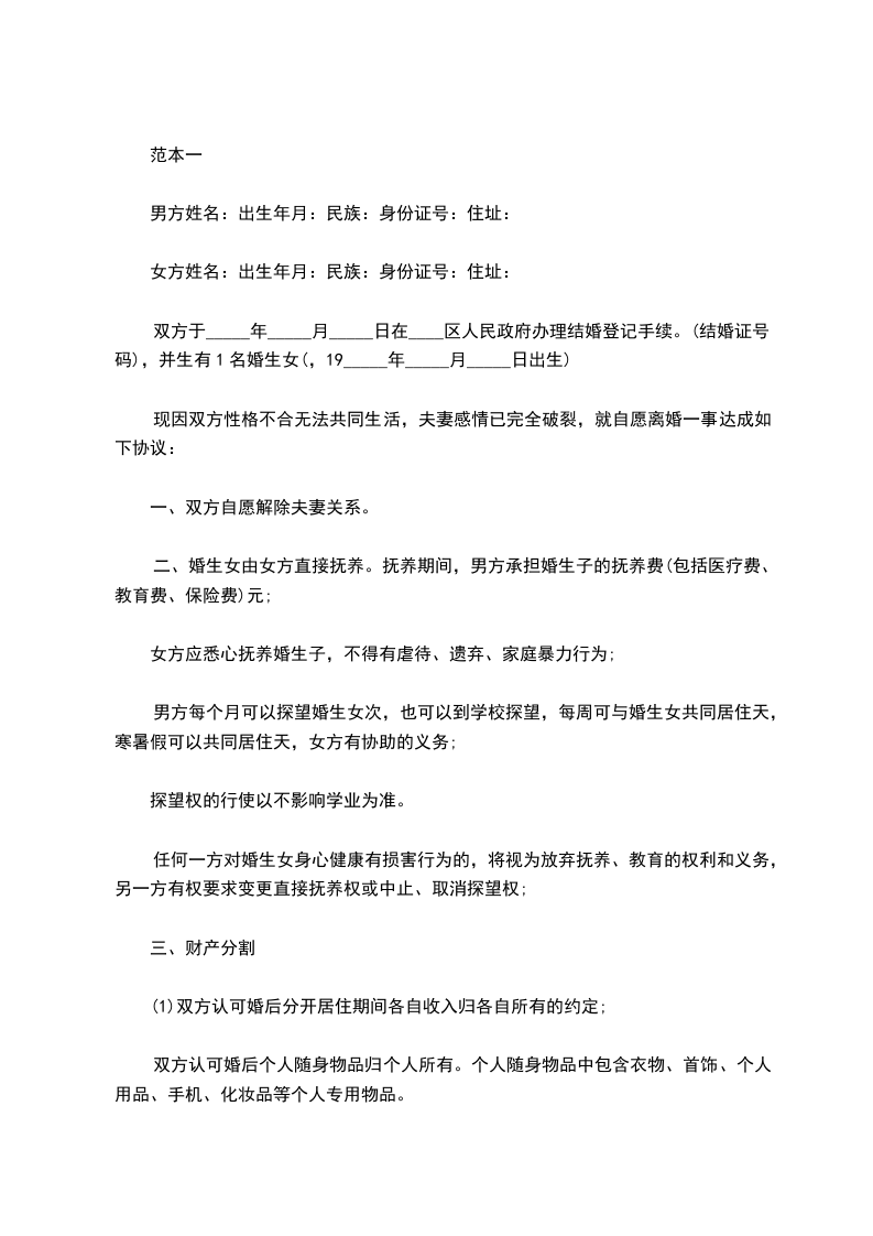 男方与女方于_____年___月___日在_____区民政局登记结婚,于_____年___月___日(农历___月___)生育一子(女),取名___月___日(性别,男/女,___族,身份证号码:_______________)。一、男女双方自愿离婚