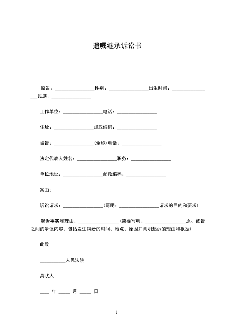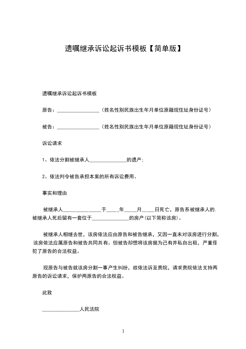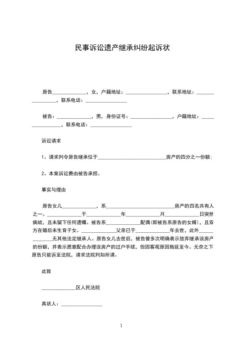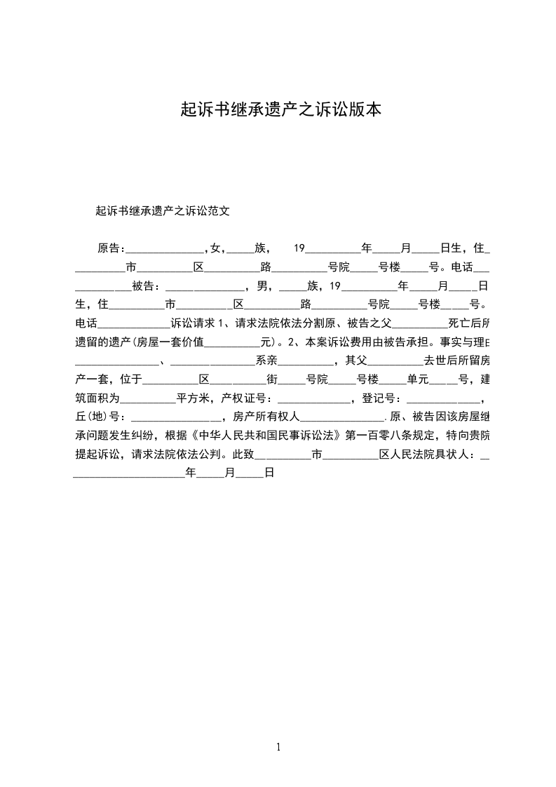 原告:______________,女,_____族,19__________年_____月_____日生,住__________市__________区__________路__________号院_____号楼_____号。电话_____________ 被告:______________,男,_____族,19__________年_____月_____日生,住__________市__________区__________路__________号院_____号楼_____号。电话_____________ 诉讼请求 1、请求法院依法分割原、被告之父__________死亡后所遗留的遗产(房屋一套价值__________元)。 2、本案诉讼费用由被告承担。 事实与理由 _______________、_______________系亲__________,其父__________去世后所留房产一套,位于__________区__________街_____号院_____号楼_____单元_____号,建筑面积为__________平方米,产权证号:_____________,登记号:_____________,丘(地)号:________________,房产所有权人_______________. 原、被告因该房屋继承问题发生纠纷,根据《中华人民共和国民事诉讼法》第一百零八条规定,特向贵院提起诉讼,请求法院依法公判。 此致 __________市__________区人民法院 具状人:_________________ _____年_____月_____日