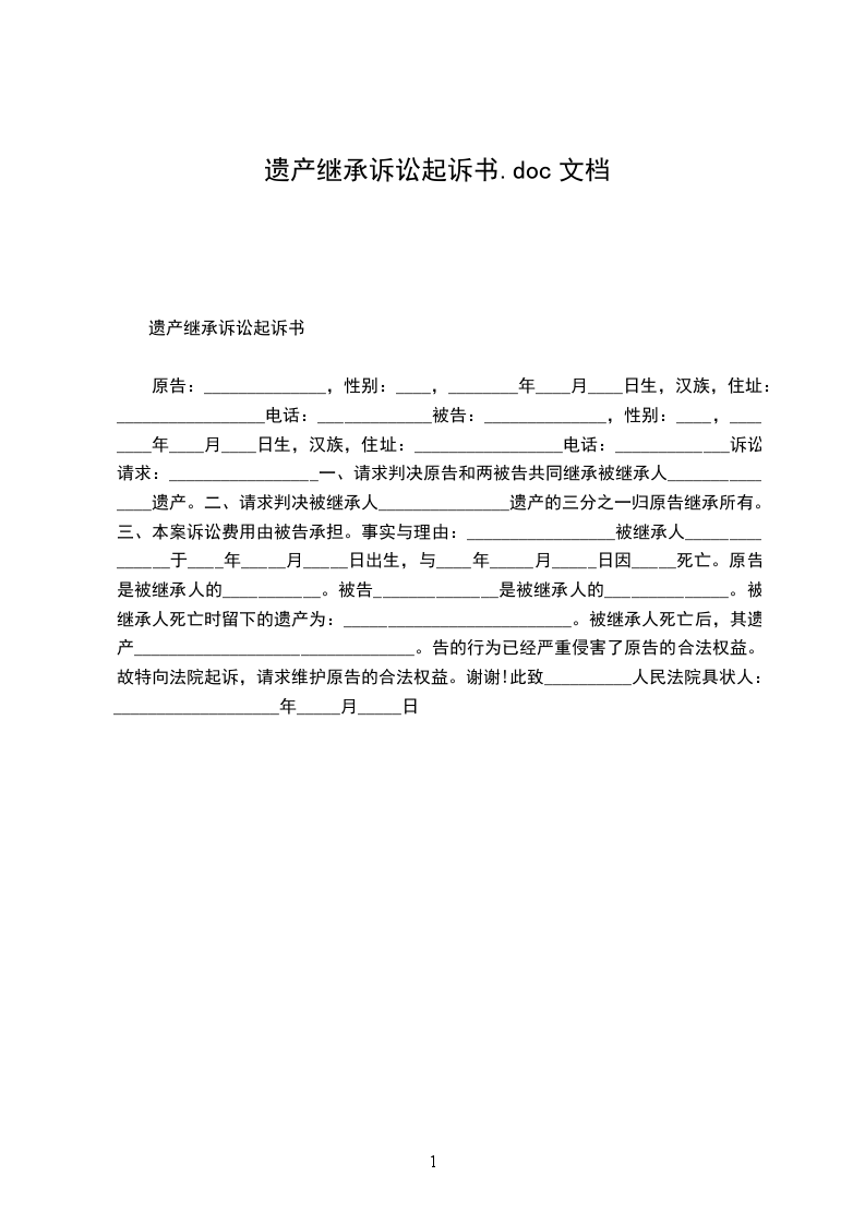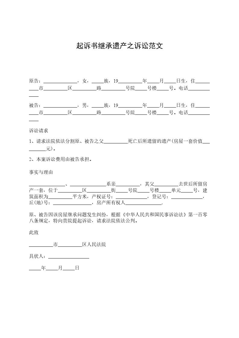 原告:______________,女,_____族,19__________年_____月_____日生,住__________市__________区__________路__________号院_____号楼_____号。电话_____________ 被告:______________,男,_____族,19__________年_____月_____日生,住__________市__________区__________路__________号院_____号楼_____号。电话_____________ 诉讼请求 1、请求法院依法分割原、被告之父__________死亡后所遗留的遗产(房屋一套价值__________元)。 2、本案诉讼费用由被告承担。 事实与理由 _______________、_______________系亲__________,其父__________去世后所留房产一套,位于__________区__________街_____号院_____号楼_____单元_____号,建筑面积为__________平方米,产权证号:_____________,登记号:_____________,丘(地)号:________________,房产所有权人_______________. 原、被告因该房屋继承问题发生纠纷,根据《中华人民共和国民事诉讼法》第一百零八条规定,特向贵院提起诉讼,请求法院依法公判。 此致 __________市__________区人民法院 具状人:_________________ _____年_____月_____日