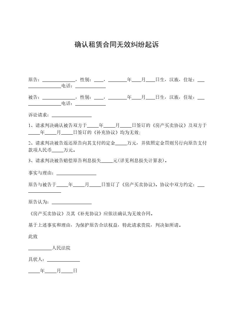 原告:______________,性别:____,________年____月____日生,汉族,住址:_________________电话:_____________ 被告:______________,性别:____,________年____月____日生,汉族,住址:_________________电话:_____________ 诉讼请求:_________________ 1、请求判决确认被告双方于_____年_____月_____日签订的《房产买卖协议》及双方于_____年_____月_____日签订的《补充协议》均为无效; 2、请求判决被告返还原告向其支付的定金_____万元,并依照定金罚则另行向原告支付款项人民币_____万元。 3、请求判决被告赔偿原告利息损失_____元(详见利息损失计算表)。 事实与理由:_________________ 原告与被告于_____年_____月_____日签订了《房产买卖协议》。协议中双方约定:_________________ 原告认为:_________________ 《房产买卖协议》及其《补充协议》应依法确认为无效合同。 基于上述事实和理由,为保护原告合法权益,特此请求贵院,判决如所请。 此致 __________人民法院 具状人:______________ _____年_____月_____日