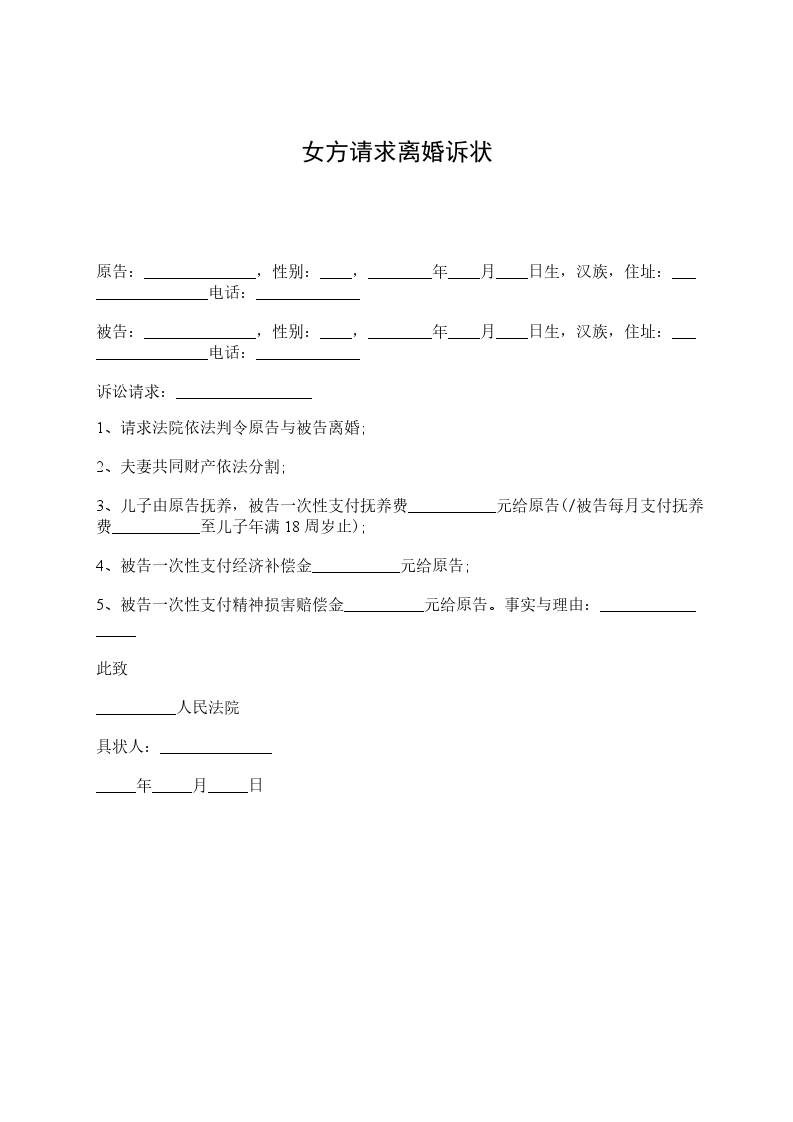 原告:______________,性别:____,________年____月____日生,汉族,住址:_________________电话:_____________ 被告:______________,性别:____,________年____月____日生,汉族,住址:_________________电话:_____________ 诉讼请求:_________________ 1、请求法院依法判令原告与被告离婚; 2、夫妻共同财产依法分割; 3、儿子由原告抚养,被告一次性支付抚养费___________元给原告(/被告每月支付抚养费___________至儿子年满18周岁止); 4、被告一次性支付经济补偿金___________元给原告; 5、被告一次性支付精神损害赔偿金__________元给原告。事实与理由:_________________ 此致 __________人民法院 具状人:______________ _____年_____月_____日