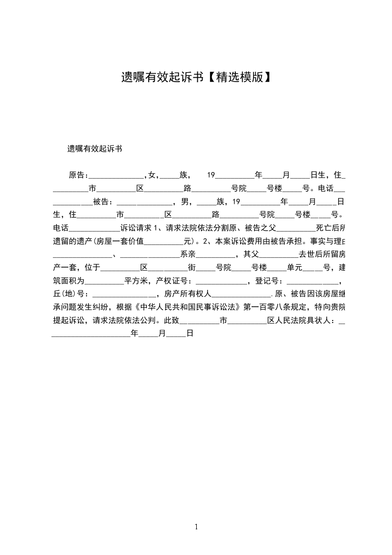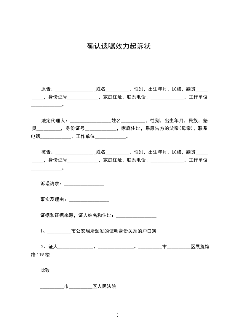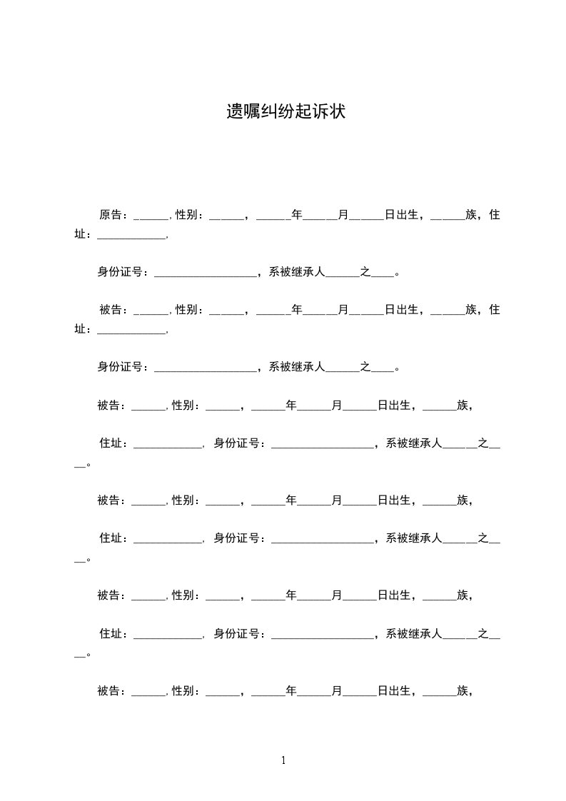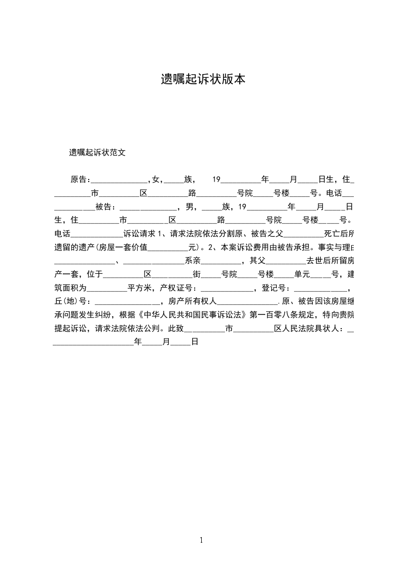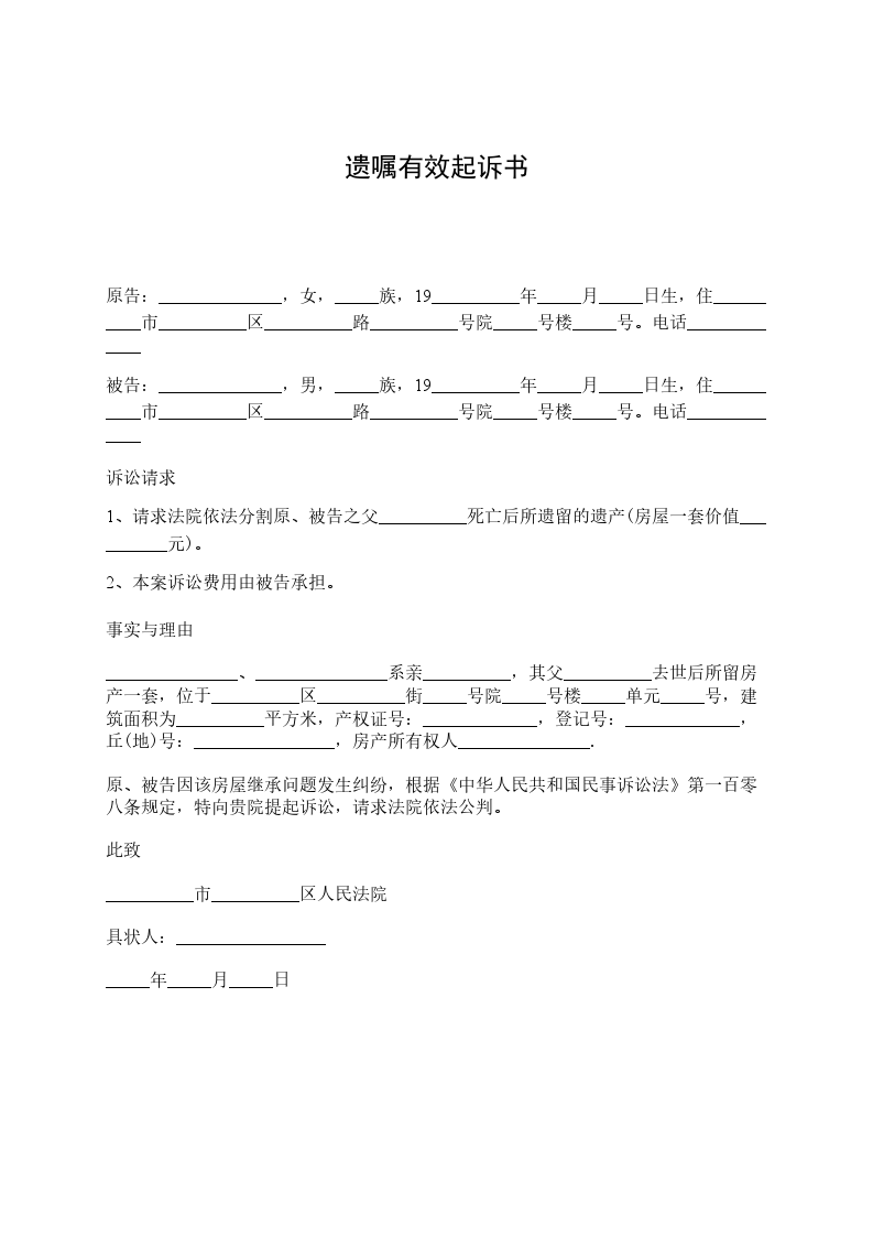 原告:______________,女,_____族,19__________年_____月_____日生,住__________市__________区__________路__________号院_____号楼_____号。电话_____________ 被告:______________,男,_____族,19__________年_____月_____日生,住__________市__________区__________路__________号院_____号楼_____号。电话_____________ 诉讼请求 1、请求法院依法分割原、被告之父__________死亡后所遗留的遗产(房屋一套价值__________元)。 2、本案诉讼费用由被告承担。 事实与理由 _______________、_______________系亲__________,其父__________去世后所留房产一套,位于__________区__________街_____号院_____号楼_____单元_____号,建筑面积为__________平方米,产权证号:_____________,登记号:_____________,丘(地)号:________________,房产所有权人_______________. 原、被告因该房屋继承问题发生纠纷,根据《中华人民共和国民事诉讼法》第一百零八条规定,特向贵院提起诉讼,请求法院依法公判。 此致 __________市__________区人民法院 具状人:_________________ _____年_____月_____日
