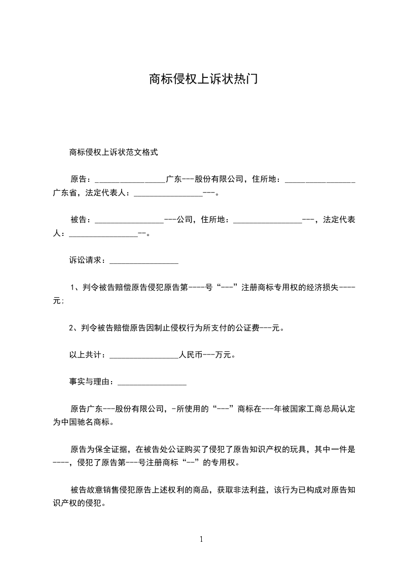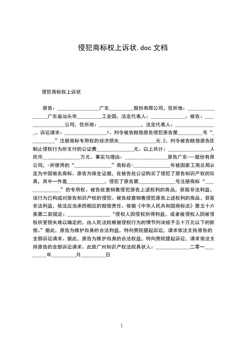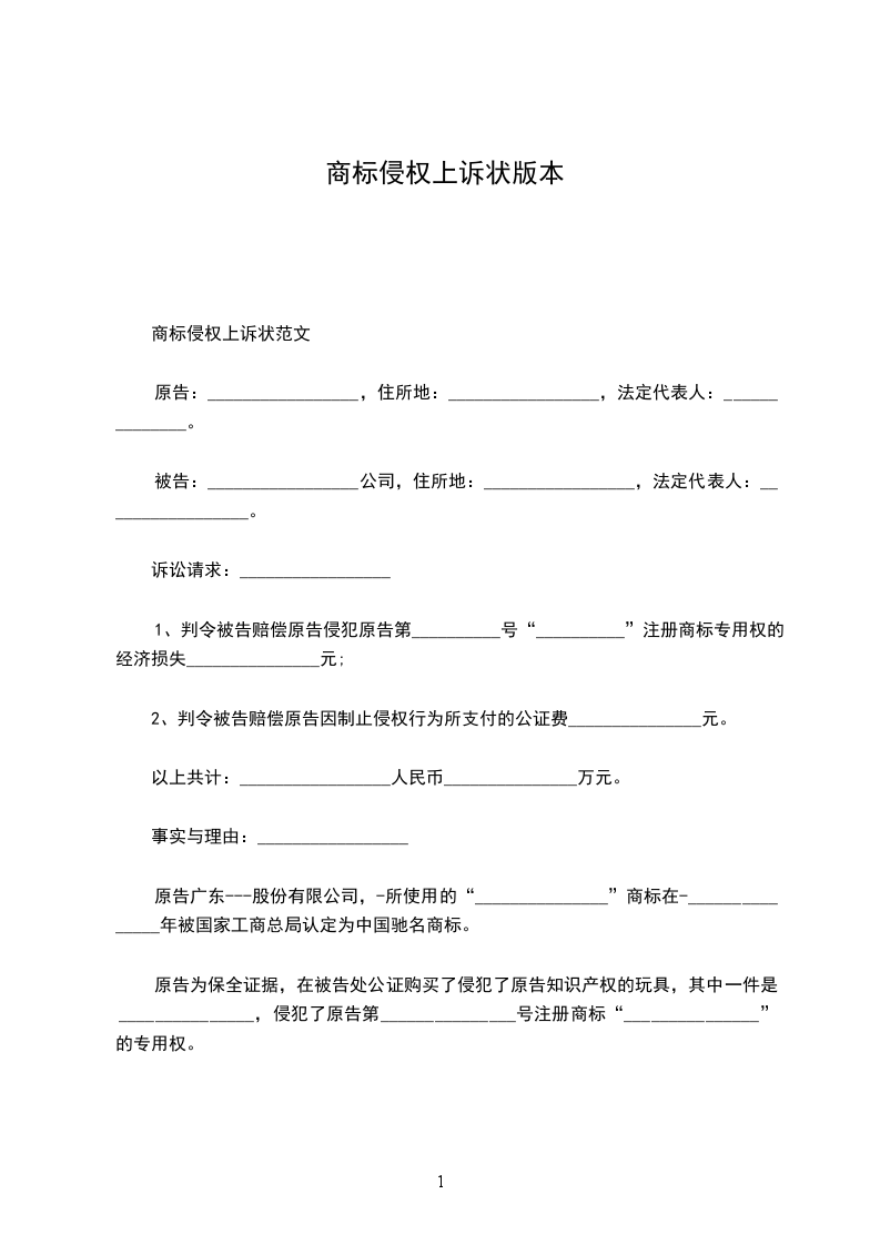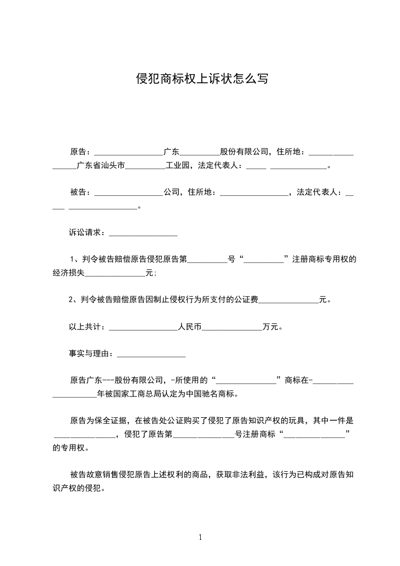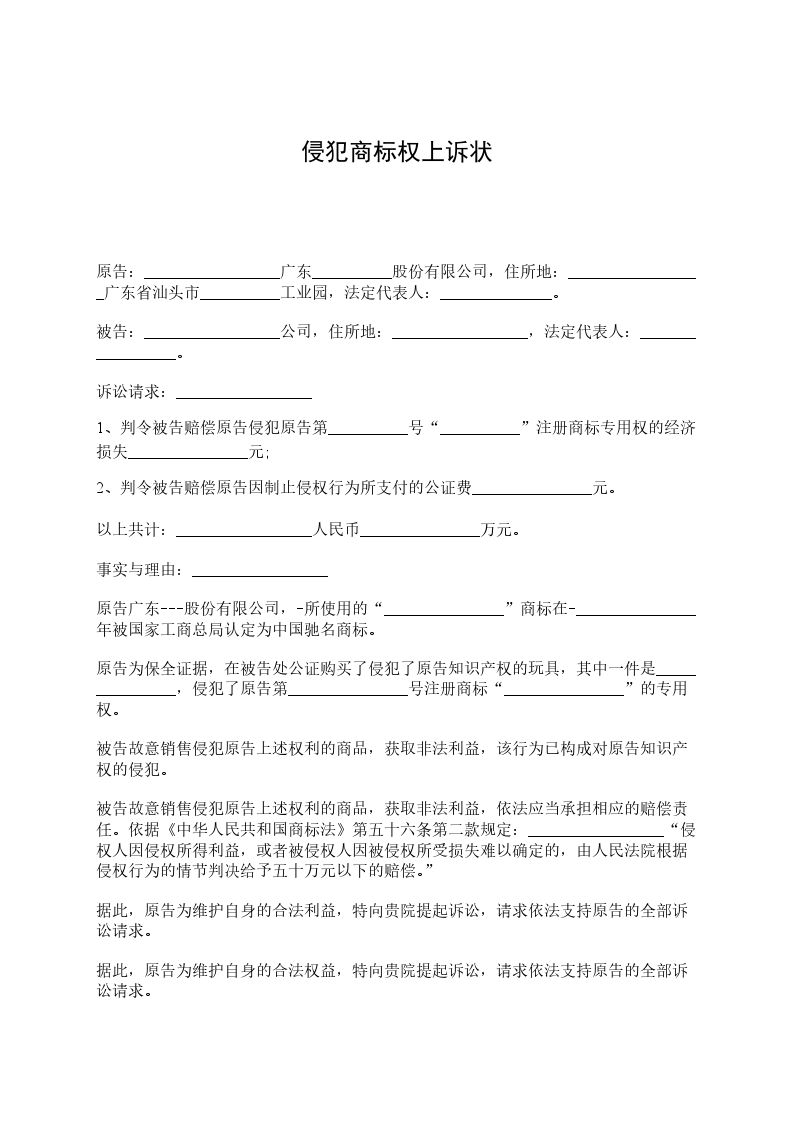 原告:_________________广东__________股份有限公司,住所地:_________________广东省汕头市__________工业园,法定代表人:______________。 被告:_________________公司,住所地:_________________,法定代表人:_________________。 诉讼请求:_________________ 1、判令被告赔偿原告侵犯原告第__________号“__________”注册商标专用权的经济损失_______________元; 2、判令被告赔偿原告因制止侵权行为所支付的公证费_______________元。 以上共计:_________________人民币_______________万元。 事实与理由:_________________ 原告广东---股份有限公司,-所使用的“_______________”商标在-_______________年被国家工商总局认定为中国驰名商标。 原告为保全证据,在被告处公证购买了侵犯了原告知识产权的玩具,其中一件是_______________,侵犯了原告第_______________号注册商标“_______________”的专用权。 被告故意销售侵犯原告上述权利的商品,获取非法利益,该行为已构成对原告知识产权的侵犯。 被告故意销售侵犯原告上述权利的商品,获取非法利益,依法应当承担相应的赔偿责任。依据《中华人民共和国商标法》第五十六条第二款规定:_________________“侵权人因侵权所得利益,或者被侵权人因被侵权所受损失难以确定的,由人民法院根据侵权行为的情节判决给予五十万元以下的赔偿。” 据此,原告为维护自身的合法利益,特向贵院提起诉讼,请求依法支持原告的全部诉讼请求。 据此,原告为维护自身的合法权益,特向贵院提起诉讼,请求依法支持原告的全部诉讼请求。 此致 广州知识产权法院 具状人:______________ 二零一__________年__________月__________日