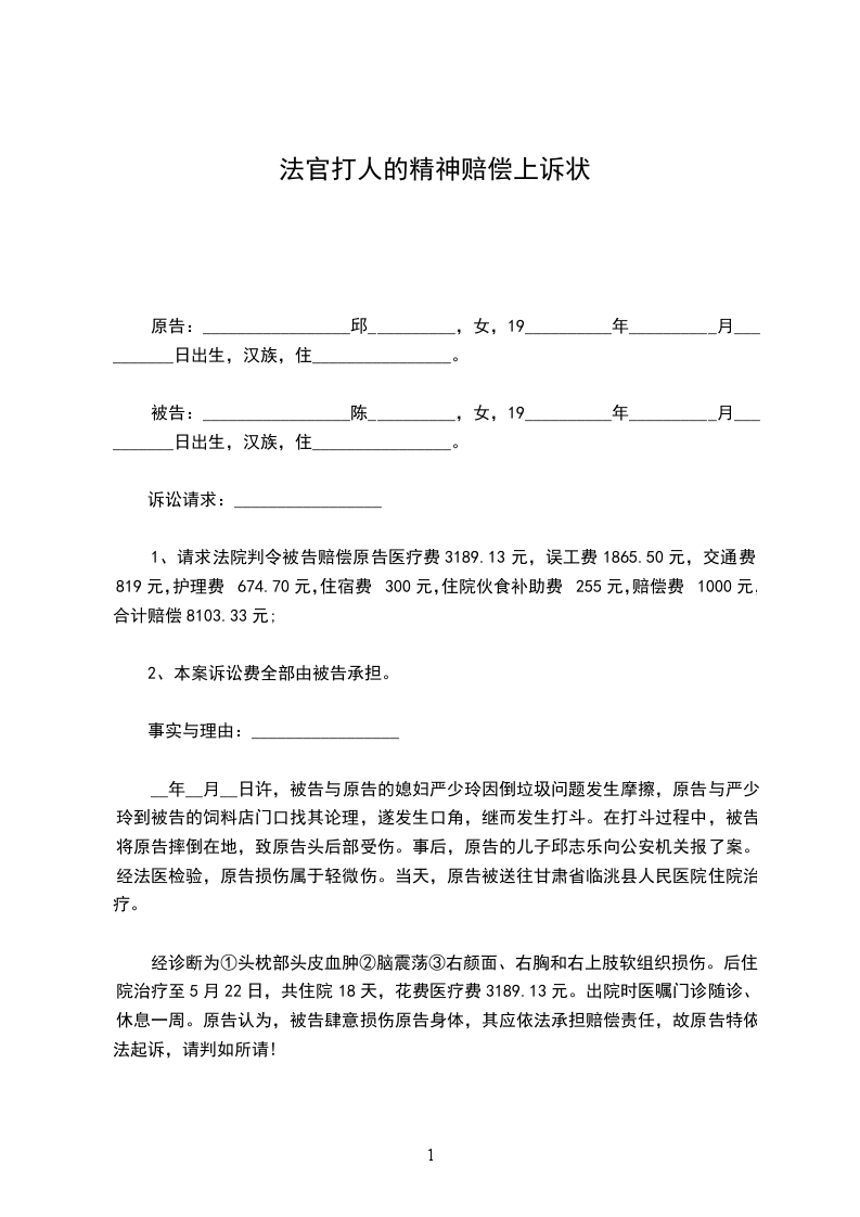1、请求法院判令被告赔偿原告医疗费3189.13元,误工费1865.50元,交通费819元,护理费674.70元,住宿费300元,住院伙食补助费255元,赔偿费1000元,合计赔偿8103.33元;