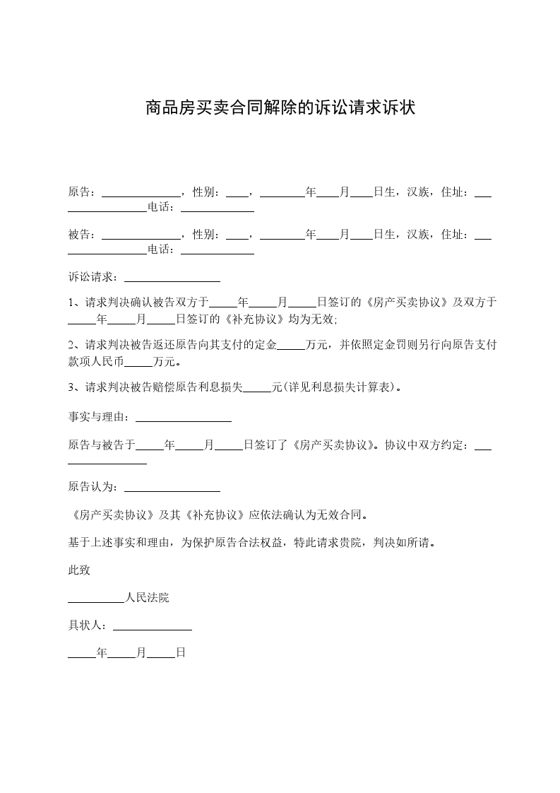 原告:______________,性别:____,________年____月____日生,汉族,住址:_________________电话:_____________ 被告:______________,性别:____,________年____月____日生,汉族,住址:_________________电话:_____________ 诉讼请求:_________________ 1、请求判决确认被告双方于_____年_____月_____日签订的《房产买卖协议》及双方于_____年_____月_____日签订的《补充协议》均为无效; 2、请求判决被告返还原告向其支付的定金_____万元,并依照定金罚则另行向原告支付款项人民币_____万元。 3、请求判决被告赔偿原告利息损失_____元(详见利息损失计算表)。 事实与理由:_________________ 原告与被告于_____年_____月_____日签订了《房产买卖协议》。协议中双方约定:_________________ 原告认为:_________________ 《房产买卖协议》及其《补充协议》应依法确认为无效合同。 基于上述事实和理由,为保护原告合法权益,特此请求贵院,判决如所请。 此致 __________人民法院 具状人:______________ _____年_____月_____日