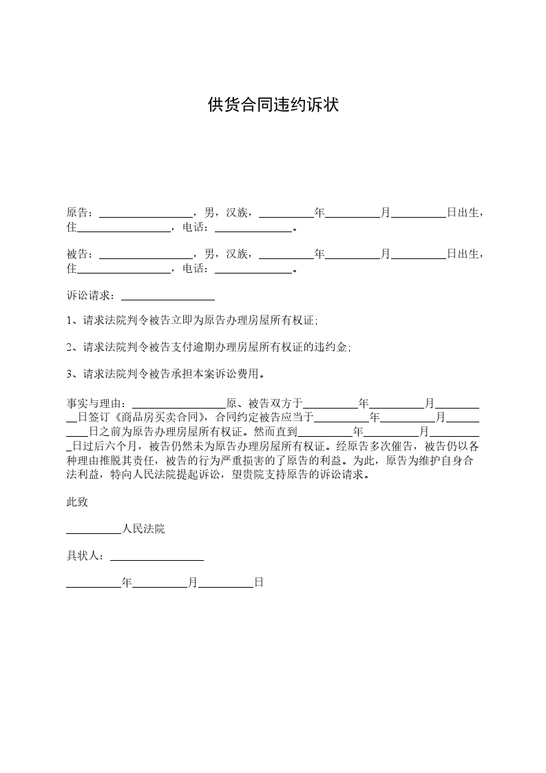 原告:_________________,男,汉族,__________年__________月__________日出生,住_________________,电话:______________。 被告:_________________,男,汉族,__________年__________月__________日出生,住_________________,电话:______________。 诉讼请求:_________________ 1、请求法院判令被告立即为原告办理房屋所有权证; 2、请求法院判令被告支付逾期办理房屋所有权证的违约金; 3、请求法院判令被告承担本案诉讼费用。 事实与理由:_________________原、被告双方于__________年__________月__________日签订《商品房买卖合同》,合同约定被告应当于__________年__________月__________日之前为原告办理房屋所有权证。然而直到__________年__________月__________日过后六个月,被告仍然未为原告办理房屋所有权证。经原告多次催告,被告仍以各种理由推脱其责任,被告的行为严重损害的了原告的利益。为此,原告为维护自身合法利益,特向人民法院提起诉讼,望贵院支持原告的诉讼请求。 此致 __________人民法院 具状人:_________________ __________年__________月__________日