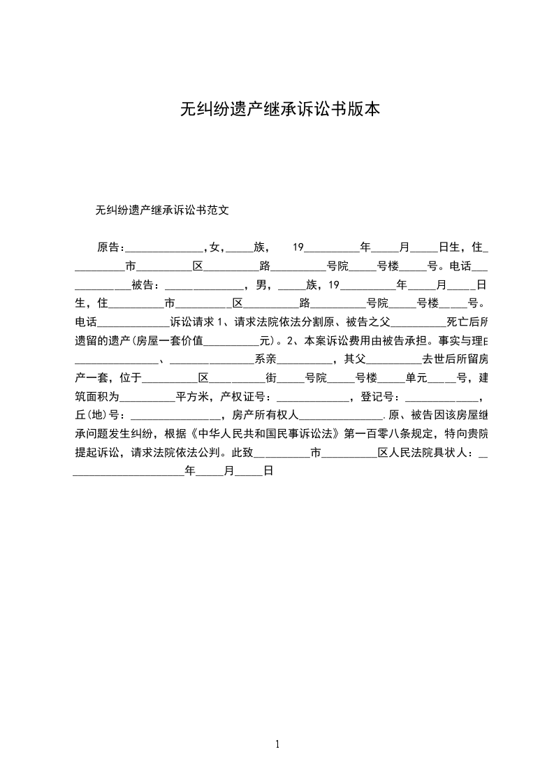原告:______________,女,_____族,19__________年_____月_____日生,住__________市__________区__________路__________号院_____号楼_____号。电话_____________ 被告:______________,男,_____族,19__________年_____月_____日生,住__________市__________区__________路__________号院_____号楼_____号。电话_____________ 诉讼请求 1、请求法院依法分割原、被告之父__________死亡后所遗留的遗产(房屋一套价值__________元)。 2、本案诉讼费用由被告承担。 事实与理由 _______________、_______________系亲__________,其父__________去世后所留房产一套,位于__________区__________街_____号院_____号楼_____单元_____号,建筑面积为__________平方米,产权证号:_____________,登记号:_____________,丘(地)号:________________,房产所有权人_______________. 原、被告因该房屋继承问题发生纠纷,根据《中华人民共和国民事诉讼法》第一百零八条规定,特向贵院提起诉讼,请求法院依法公判。 此致 __________市__________区人民法院 具状人:_________________ _____年_____月_____日