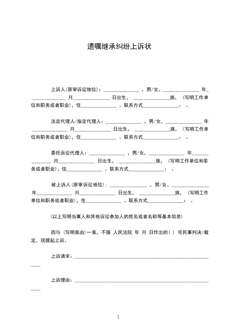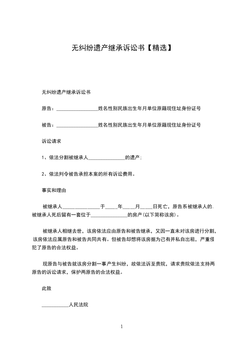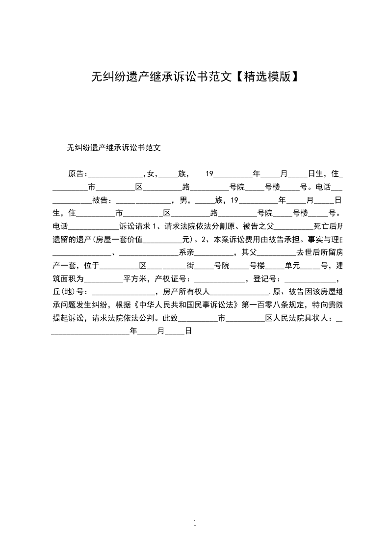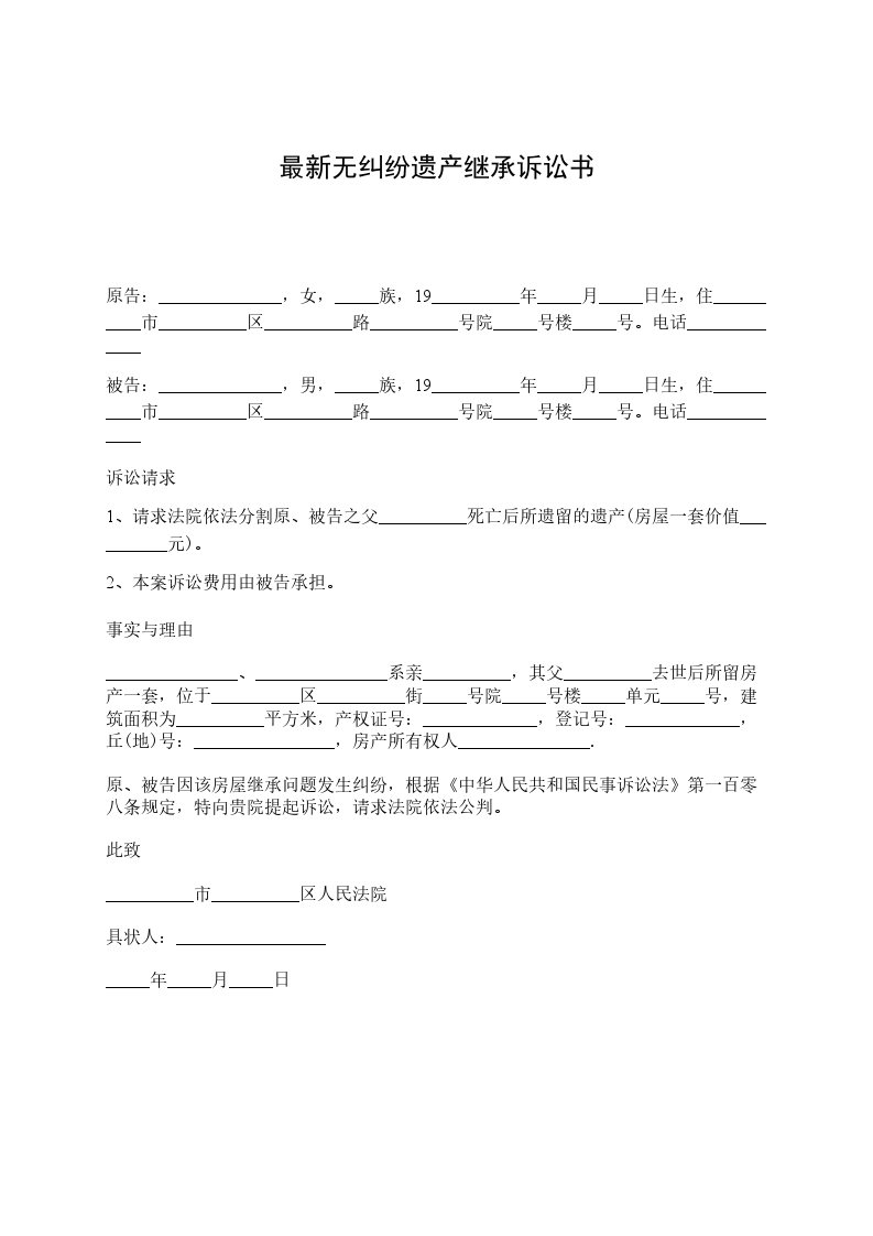原告:______________,女,_____族,19__________年_____月_____日生,住__________市__________区__________路__________号院_____号楼_____号。电话_____________ 被告:______________,男,_____族,19__________年_____月_____日生,住__________市__________区__________路__________号院_____号楼_____号。电话_____________ 诉讼请求 1、请求法院依法分割原、被告之父__________死亡后所遗留的遗产(房屋一套价值__________元)。 2、本案诉讼费用由被告承担。 事实与理由 _______________、_______________系亲__________,其父__________去世后所留房产一套,位于__________区__________街_____号院_____号楼_____单元_____号,建筑面积为__________平方米,产权证号:_____________,登记号:_____________,丘(地)号:________________,房产所有权人_______________. 原、被告因该房屋继承问题发生纠纷,根据《中华人民共和国民事诉讼法》第一百零八条规定,特向贵院提起诉讼,请求法院依法公判。 此致 __________市__________区人民法院 具状人:_________________ _____年_____月_____日