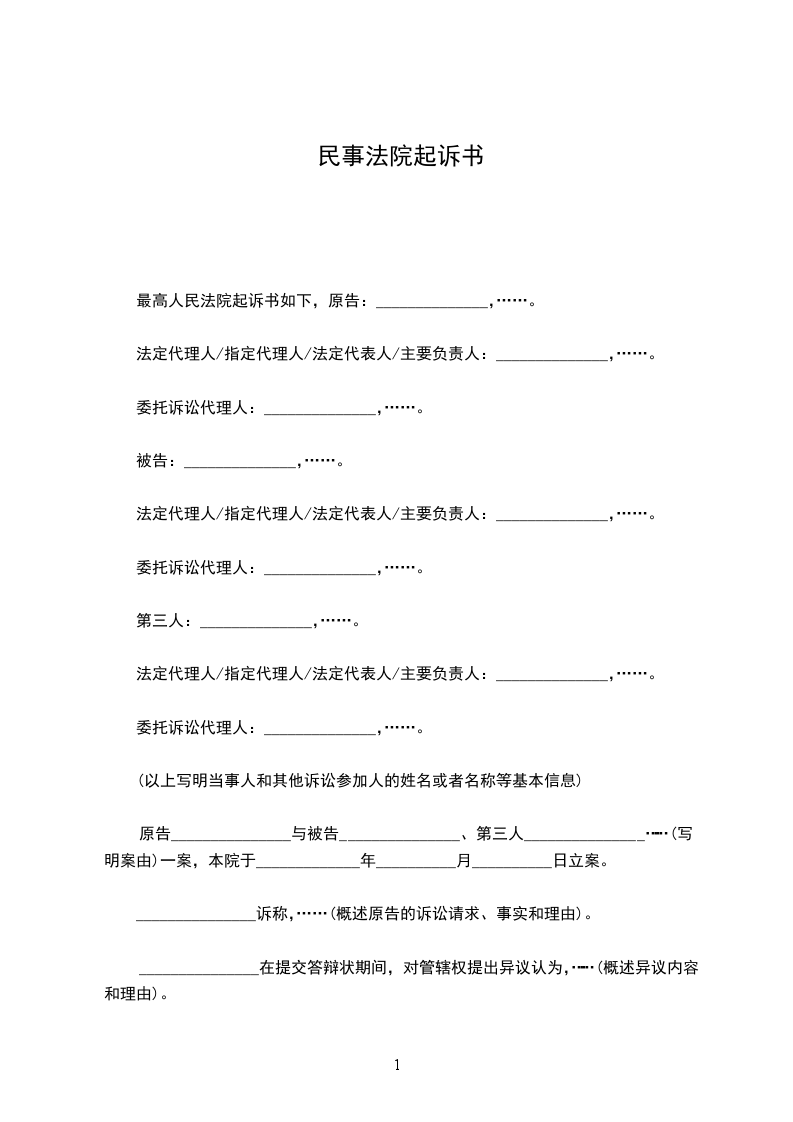 最高人民法院起诉书如下,原告:______________,……。