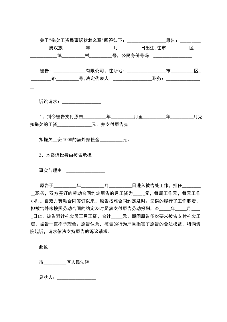 关于"拖欠工资民事诉状怎么写"回答如下:_________________原告:_________________男汉族__________年__________月__________日出生,住市__________区_______________镇__________村__________号,公民身份号码:_________________