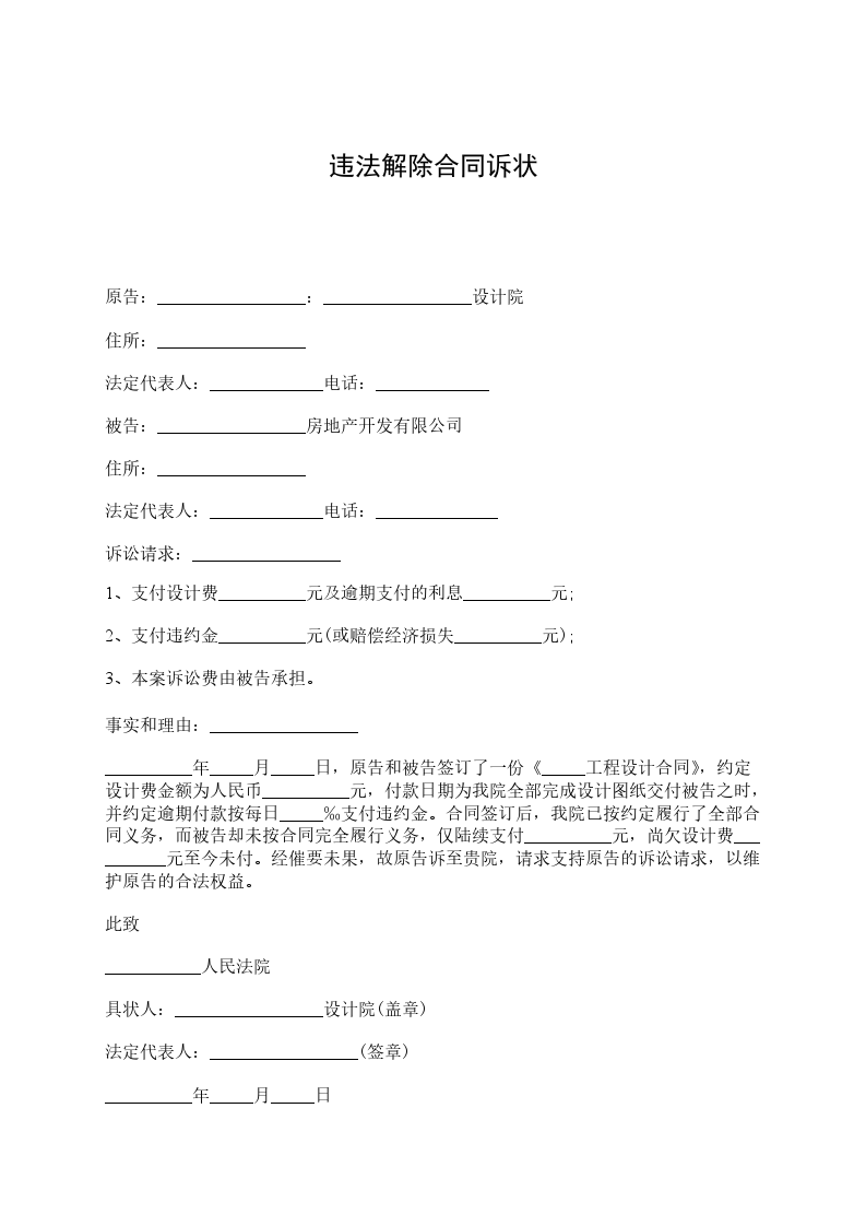 原告:_________________:_________________设计院 住所:_________________ 法定代表人:_____________电话:_____________ 被告:_________________房地产开发有限公司 住所:_________________ 法定代表人:_____________电话:______________ 诉讼请求:_________________ 1、支付设计费__________元及逾期支付的利息__________元; 2、支付违约金__________元(或赔偿经济损失__________元); 3、本案诉讼费由被告承担。 事实和理由:_________________ __________年_____月_____日,原告和被告签订了一份《_____工程设计合同》,约定设计费金额为人民币__________元,付款日期为我院全部完成设计图纸交付被告之时,并约定逾期付款按每日_____‰支付违约金。合同签订后,我院已按约定履行了全部合同义务,而被告却未按合同完全履行义务,仅陆续支付__________元,尚欠设计费__________元至今未付。经催要未果,故原告诉至贵院,请求支持原告的诉讼请求,以维护原告的合法权益。 此致 ___________人民法院 具状人:_________________设计院(盖章) 法定代表人:_________________(签章) __________年_____月_____日 附:_________________合同副本__________份。 本诉状副本______份。 其它证明文件_____份。