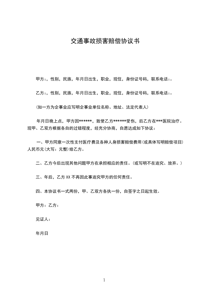 一、甲方同意一次性支付医疗费及各种人身损害赔偿费用(或具体写明赔偿项目)人民币_____元(大写:元整)给乙方。