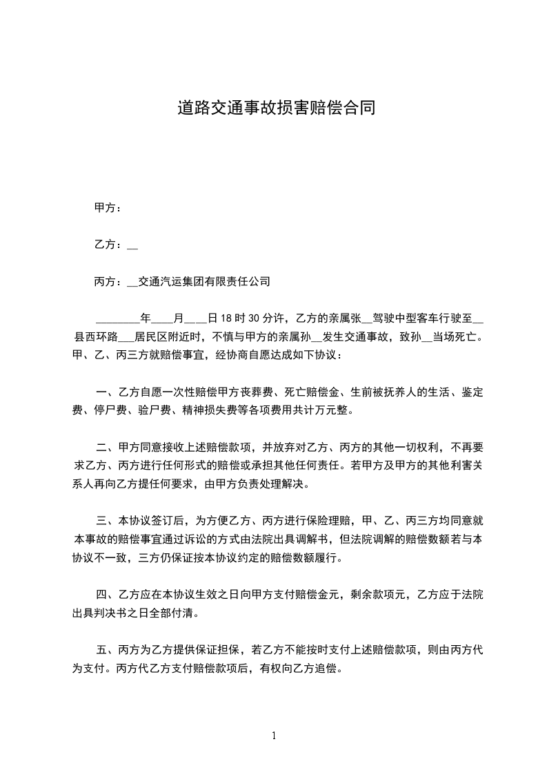 _____年_____月_____日晚上点,甲方因******,致使乙方******受伤,后乙方在***医院治疗。现甲、乙双方根据各自的过错程度,经充分协商,自愿达成如下协议: