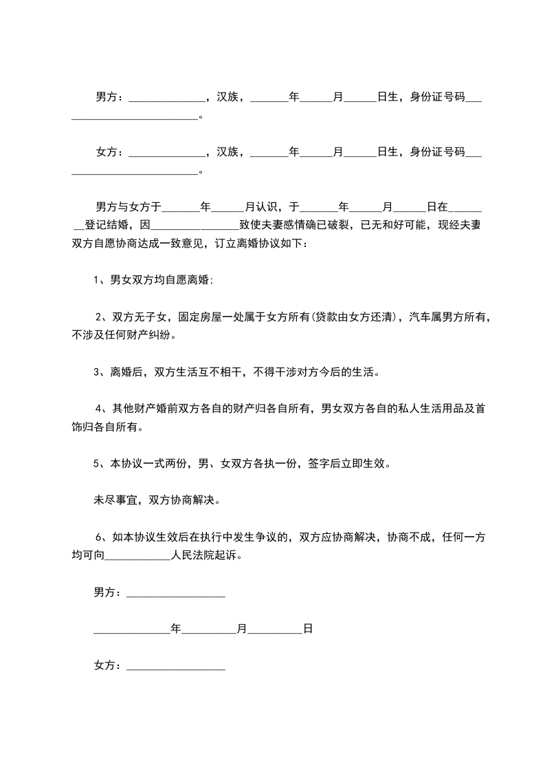 男方与女方现因夫妻感情彻底破裂自愿离婚,经双方商定,对有关事项达成以下协议: