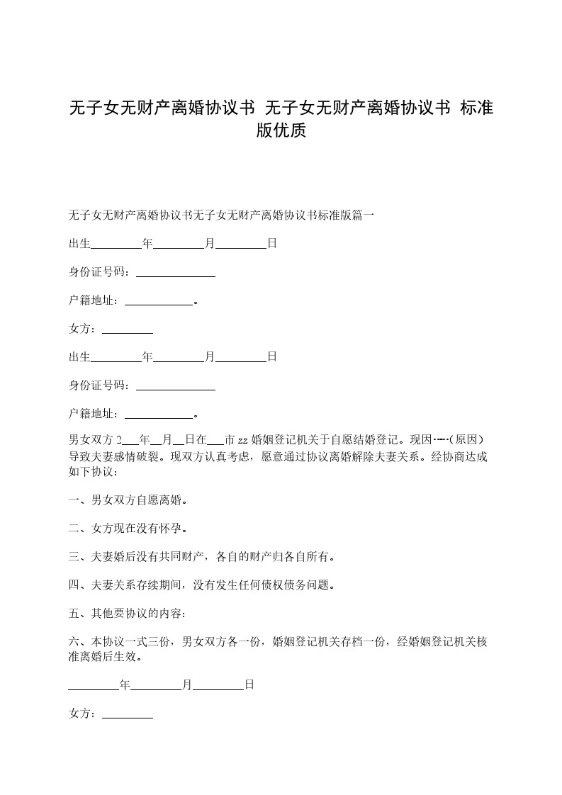 男、女双方于20XX年XX月XX日办理结婚登记,婚后未生育子女。因双方性格不合,无法继续共同生活,夫妻感情完全破裂,已无和好可能。现男女双方本着平等、自愿原则,经协商一致,就双方自愿离婚一事达成协议如下: