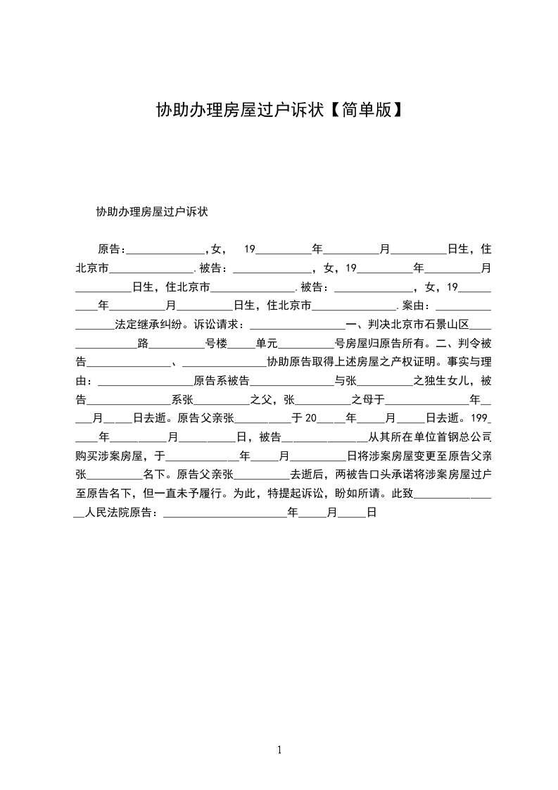 原告:______________,女,19__________年__________月__________日生,住北京市_______________. 被告:______________,女,19__________年__________月__________日生,住北京市_______________. 被告:______________,女,19__________年__________月__________日生,住北京市_______________. 案由:_________________法定继承纠纷。 诉讼请求:_________________ 一、判决北京市石景山区_______________路__________号楼_____单元__________号房屋归原告所有。 二、判令被告_______________、_______________协助原告取得上述房屋之产权证明。 事实与理由:_________________ 原告系被告_______________与张__________之独生女儿,被告_______________系张__________之父,张__________之母于_______________年_____月_____日去逝。原告父亲张__________于20_____年_____月_____日去逝。 199_____年__________月__________日,被告_______________从其所在单位首钢总公司购买涉案房屋,于_____________年_____月__________日将涉案房屋变更至原告父亲张__________名下。 原告父亲张__________去逝后,两被告口头承诺将涉案房屋过户至原告名下,但一直未予履行。为此,特提起诉讼,盼如所请。 此致 ________________ 人民法院 原告:_________________ _____年_____月_____日