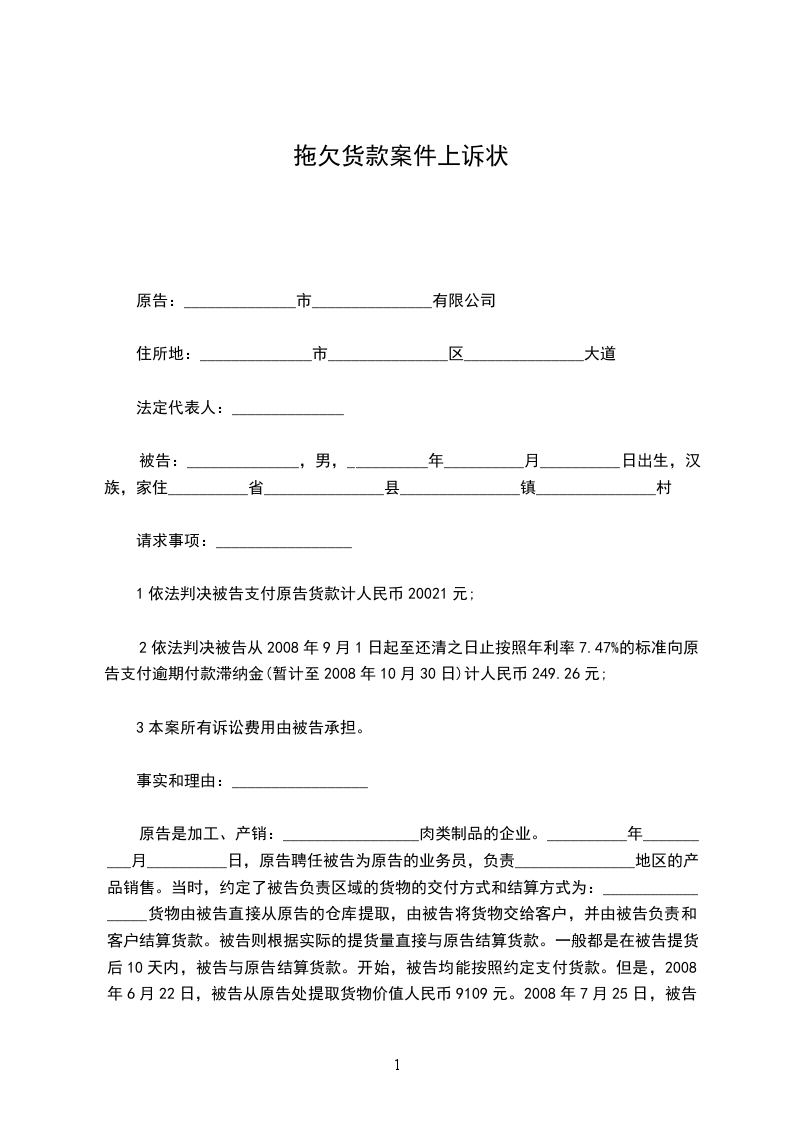 原告是加工、产销:_________________肉类制品的企业。__________年__________月__________日,原告聘任被告为原告的业务员,负责_______________地区的产品销售。当时,约定了被告负责区域的货物的交付方式和结算方式为:_________________货物由被告直接从原告的仓库提取,由被告将货物交给客户,并由被告负责和客户结算货款。被告则根据实际的提货量直接与原告结算货款。一般都是在被告提货后10天内,被告与原告结算货款。开始,被告均能按照约定支付货款。但是,2008年6月22日,被告从原告处提取货物价值人民币9109元。2008年7月25日,被告从原告处提取货物价值人民币10912元。两次共计货物价值人民币20021元。被告均没有依约向原告支付货款。为此,原告多次向被告催收,被告却无故推诿拒不支付至今。