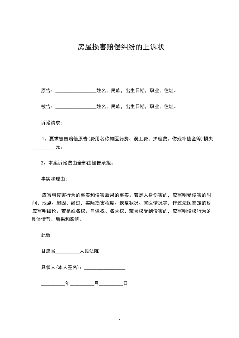 1、要求被告赔偿原告(费用名称如医药费、误工费、护理费、伤残补偿金等)损失__________元。