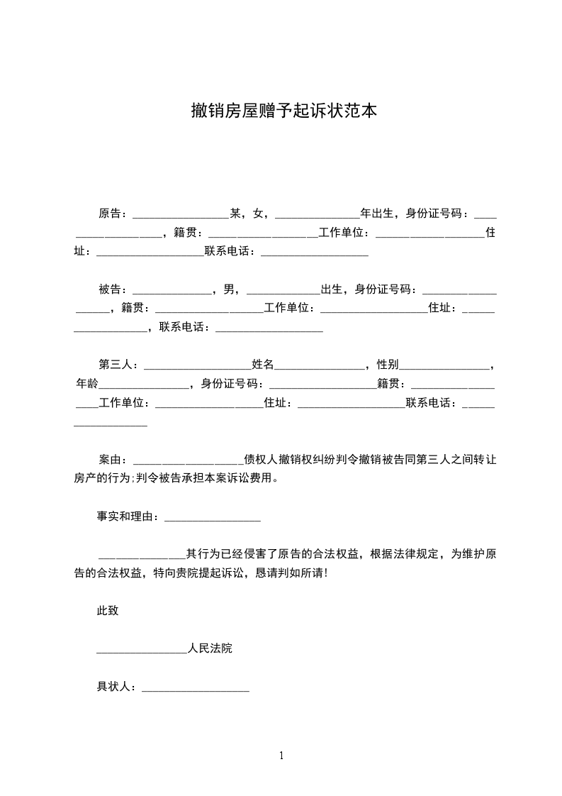 1、请求人民法院依法撤销原、被告的房屋赠与协议;