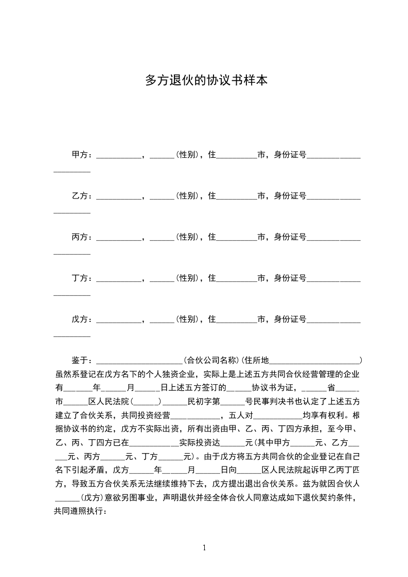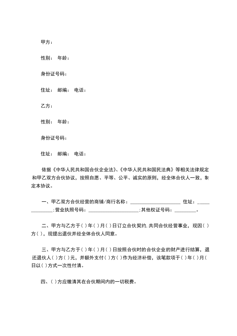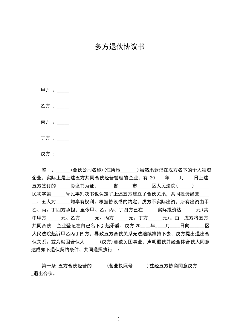 第一条五方合伙经营的____________(营业执照号____________)兹经五方协商同意戊方______退出合伙。