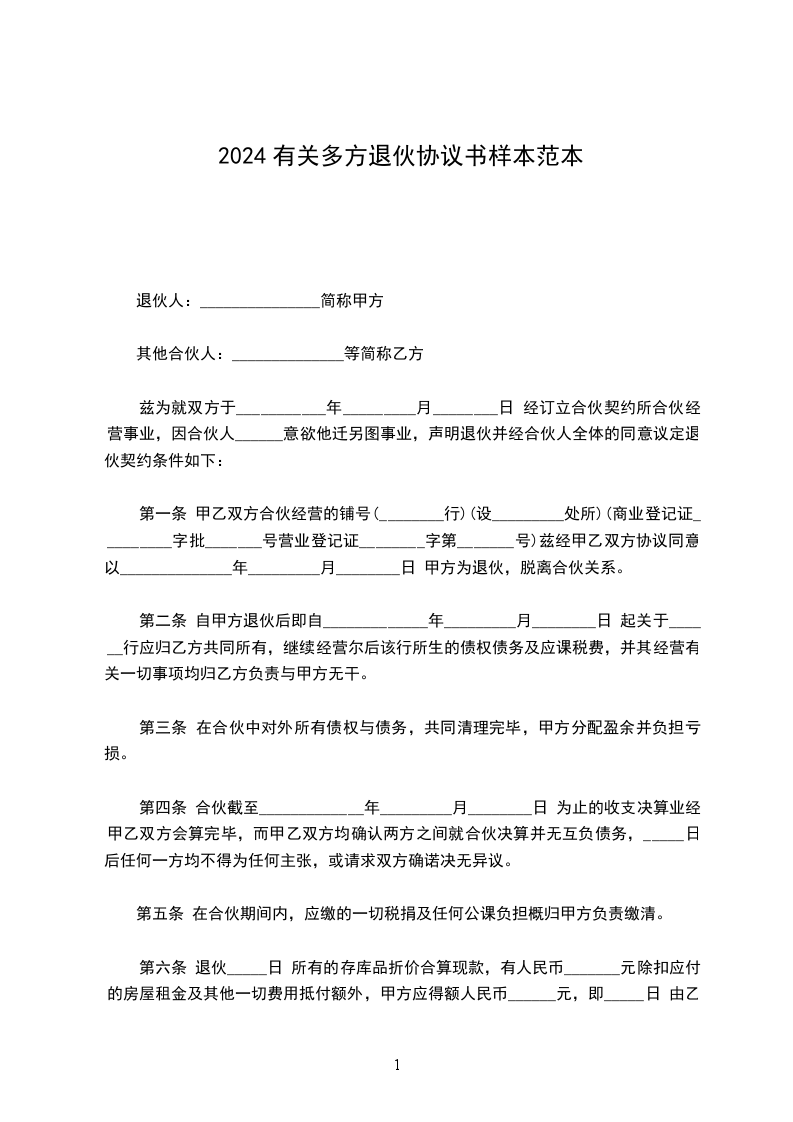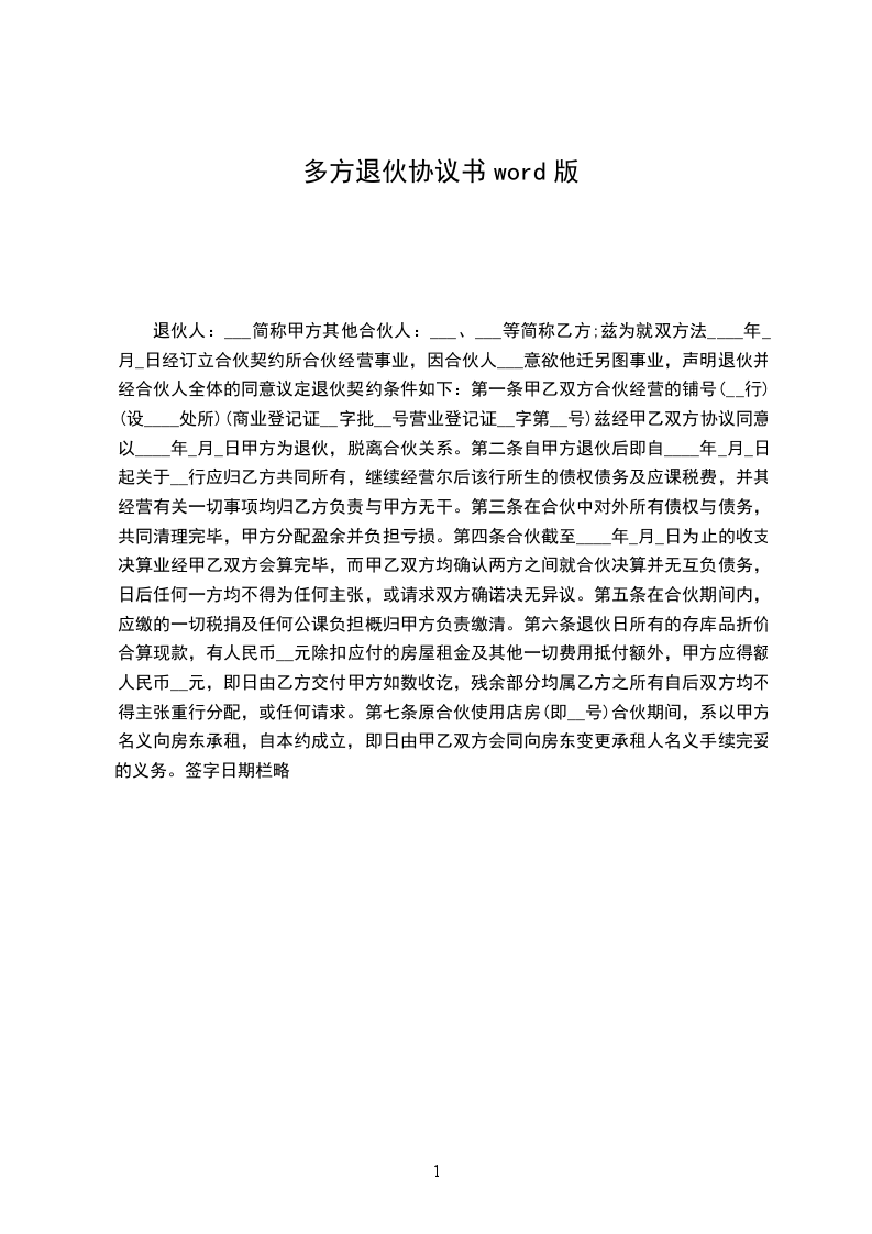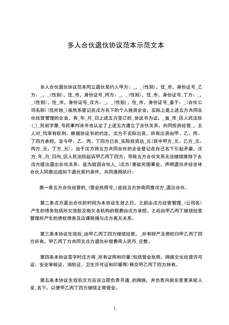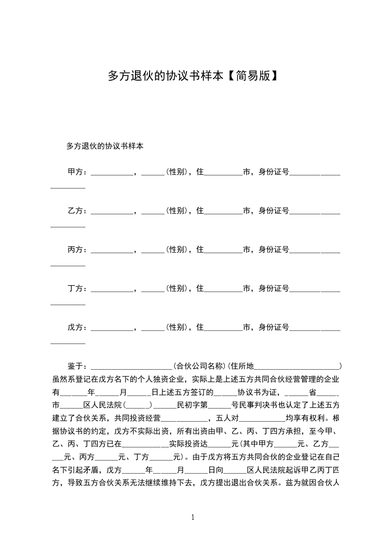 第一条五方合伙经营的____________(营业执照号____________)兹经五方协商同意戊方______退出合伙。
