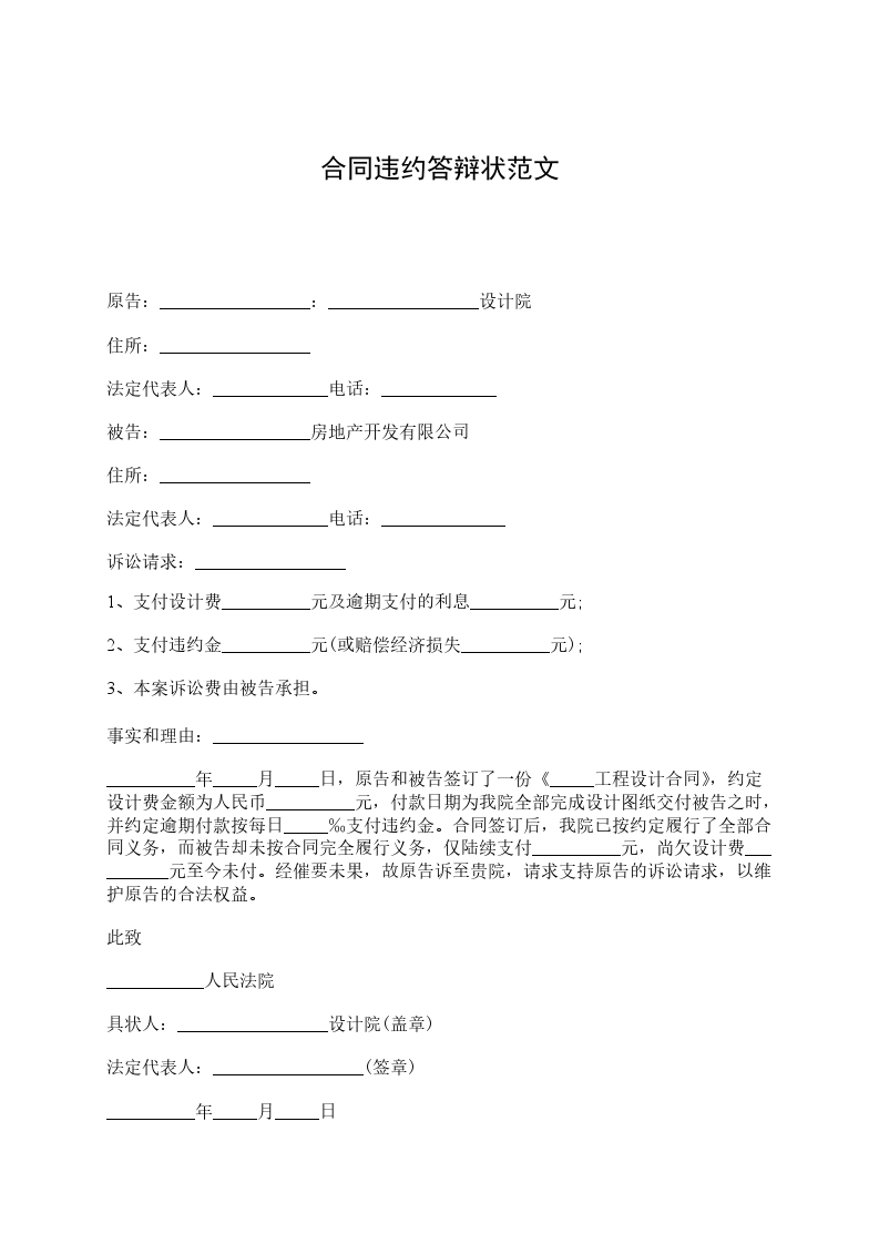 原告:_________________:_________________设计院 住所:_________________ 法定代表人:_____________电话:_____________ 被告:_________________房地产开发有限公司 住所:_________________ 法定代表人:_____________电话:______________ 诉讼请求:_________________ 1、支付设计费__________元及逾期支付的利息__________元; 2、支付违约金__________元(或赔偿经济损失__________元); 3、本案诉讼费由被告承担。 事实和理由:_________________ __________年_____月_____日,原告和被告签订了一份《_____工程设计合同》,约定设计费金额为人民币__________元,付款日期为我院全部完成设计图纸交付被告之时,并约定逾期付款按每日_____‰支付违约金。合同签订后,我院已按约定履行了全部合同义务,而被告却未按合同完全履行义务,仅陆续支付__________元,尚欠设计费__________元至今未付。经催要未果,故原告诉至贵院,请求支持原告的诉讼请求,以维护原告的合法权益。 此致 ___________人民法院 具状人:_________________设计院(盖章) 法定代表人:_________________(签章) __________年_____月_____日 附:_________________合同副本__________份。 本诉状副本______份。 其它证明文件_____份。