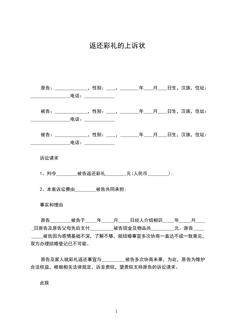 1、判令_________被告返还彩礼_________元(人民币_________);
