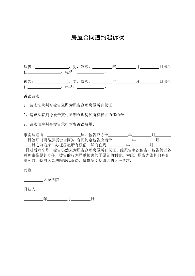原告:_________________,男,汉族,__________年__________月__________日出生,住_________________,电话:______________。 被告:_________________,男,汉族,__________年__________月__________日出生,住_________________,电话:______________。 诉讼请求:_________________ 1、请求法院判令被告立即为原告办理房屋所有权证; 2、请求法院判令被告支付逾期办理房屋所有权证的违约金; 3、请求法院判令被告承担本案诉讼费用。 事实与理由:_________________原、被告双方于__________年__________月__________日签订《商品房买卖合同》,合同约定被告应当于__________年__________月__________日之前为原告办理房屋所有权证。然而直到__________年__________月__________日过后六个月,被告仍然未为原告办理房屋所有权证。经原告多次催告,被告仍以各种理由推脱其责任,被告的行为严重损害的了原告的利益。为此,原告为维护自身合法利益,特向人民法院提起诉讼,望贵院支持原告的诉讼请求。 此致 __________人民法院 具状人:_________________ __________年__________月__________日