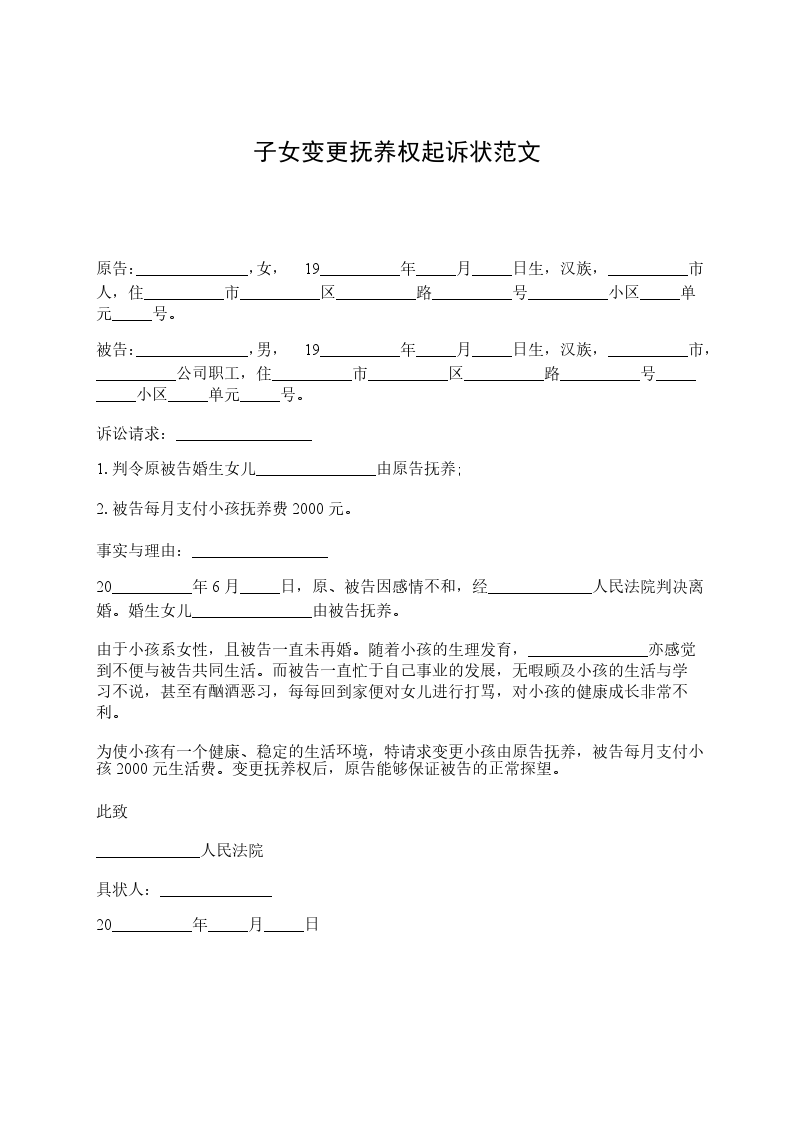 原告:______________,女,19__________年_____月_____日生,汉族,__________市人,住__________市__________区__________路__________号__________小区_____单元_____号。 被告:______________,男,19__________年_____月_____日生,汉族,__________市,__________公司职工,住__________市__________区__________路__________号__________小区_____单元_____号。 诉讼请求:_________________ 1.判令原被告婚生女儿_______________由原告抚养; 2.被告每月支付小孩抚养费2000元。 事实与理由:_________________ 20__________年6月_____日,原、被告因感情不和,经_____________人民法院判决离婚。婚生女儿_______________由被告抚养。 由于小孩系女性,且被告一直未再婚。随着小孩的生理发育,_______________亦感觉到不便与被告共同生活。而被告一直忙于自己事业的发展,无暇顾及小孩的生活与学习不说,甚至有酗酒恶习,每每回到家便对女儿进行打骂,对小孩的健康成长非常不利。 为使小孩有一个健康、稳定的生活环境,特请求变更小孩由原告抚养,被告每月支付小孩2000元生活费。变更抚养权后,原告能够保证被告的正常探望。 此致 _____________人民法院 具状人:______________ 20__________年_____月_____日