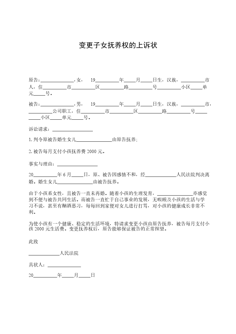 原告:______________,女,19__________年_____月_____日生,汉族,__________市人,住__________市__________区__________路__________号__________小区_____单元_____号。 被告:______________,男,19__________年_____月_____日生,汉族,__________市,__________公司职工,住__________市__________区__________路__________号__________小区_____单元_____号。 诉讼请求:_________________ 1.判令原被告婚生女儿_______________由原告抚养; 2.被告每月支付小孩抚养费2000元。 事实与理由:_________________ 20__________年6月_____日,原、被告因感情不和,经_____________人民法院判决离婚。婚生女儿_______________由被告抚养。 由于小孩系女性,且被告一直未再婚。随着小孩的生理发育,_______________亦感觉到不便与被告共同生活。而被告一直忙于自己事业的发展,无暇顾及小孩的生活与学习不说,甚至有酗酒恶习,每每回到家便对女儿进行打骂,对小孩的健康成长非常不利。 为使小孩有一个健康、稳定的生活环境,特请求变更小孩由原告抚养,被告每月支付小孩2000元生活费。变更抚养权后,原告能够保证被告的正常探望。 此致 _____________人民法院 具状人:______________ 20__________年_____月_____日