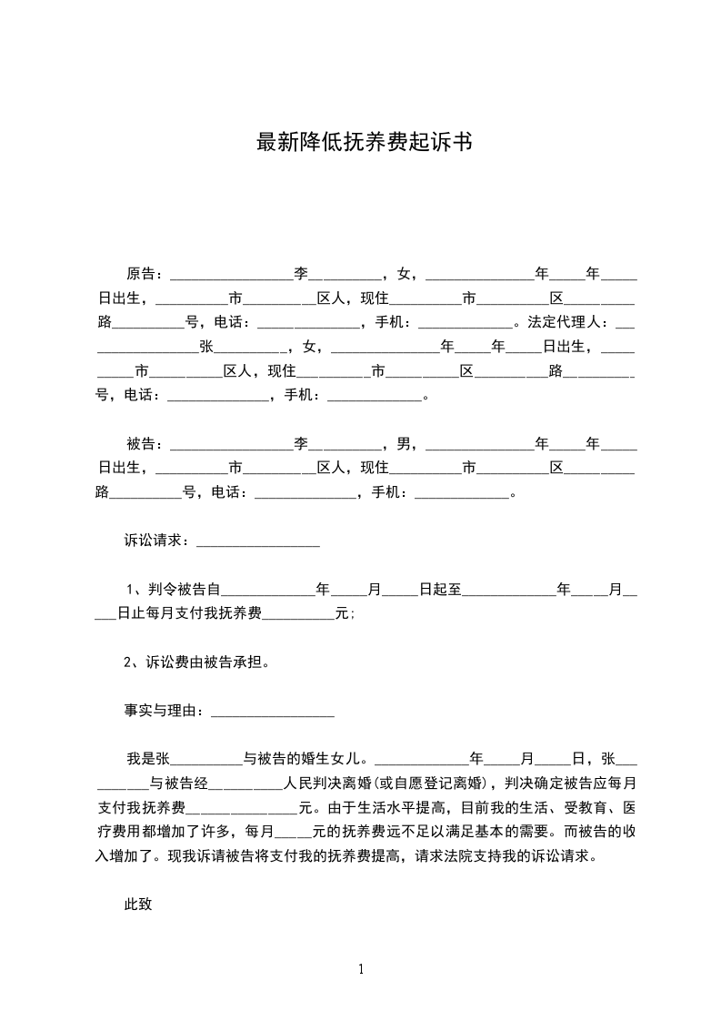我是张__________与被告的婚生女儿。_____________年_____月_____日,张__________与被告经__________人民判决离婚(或自愿登记离婚),判决确定被告应每月支付我抚养费_______________元。由于生活水平提高,目前我的生活、受教育、医疗费用都增加了许多,每月_____元的抚养费远不足以满足基本的需要。而被告的收入增加了。现我诉请被告将支付我的抚养费提高,请求法院支持我的诉讼请求。