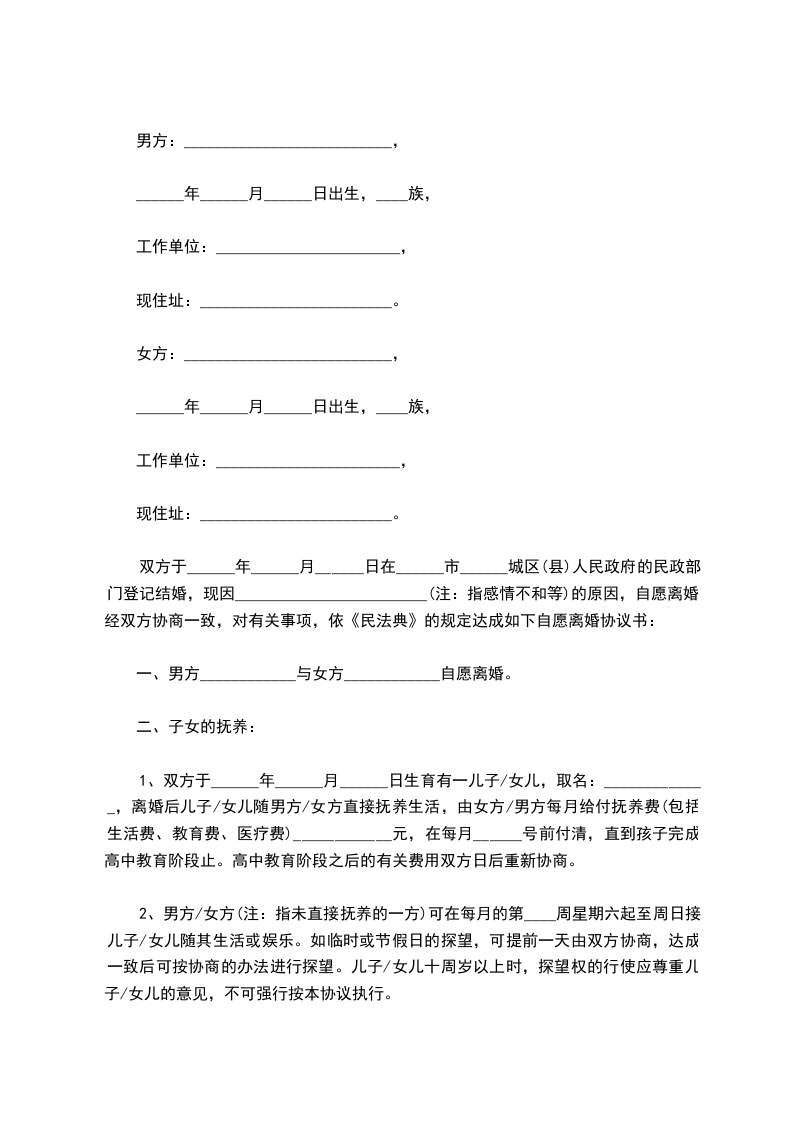 1、双方于______年______月______日生育有一儿子/女儿,取名:_____________,离婚后儿子/女儿随男方/女方直接抚养生活,由女方/男方每月给付抚养费(包括生活费、教育费、医疗费)____________元,在每月______号前付清,直到孩子完成高中教育阶段止。高中教育阶段之后的有关费用双方日后重新协商。