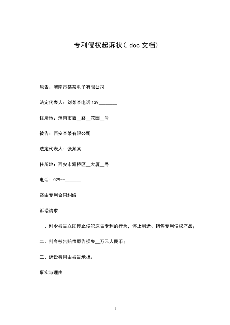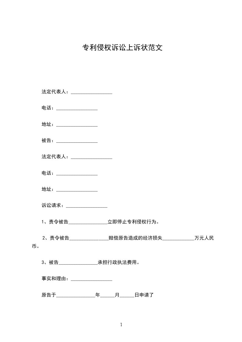 原告:_____________有限公司 法定代表人:______________ 地址:__________________ 被告:__________________ 住所地:________________ 法定代表人:______________ 诉讼请求:_________________ 1、判令被告立即停止对原告的“________________”的外观设计专利权的侵权; 2、判令被告赔偿原告的经济损失人民币_______________万元; 3、判令被告销毁所有库存侵权产品以及专用模具; 3、本案诉讼费由被告承担。 事实和理由:_________________ 原告是于_____________年__________月__________日申请外观设计专利,其专利号为:_________________ZL__________________,名称为________________。该专利权目前有效。 原告发现被告在其经营场所内,以盈利为目的大量生产、销售侵犯上述专利权的产品,其仿造的涉嫌侵权产品压低价格进行大量销售,给原告及专利权人的合法权益造成极大的损害。 原告认为,被告的行为已侵犯了上述专利权,应立即停止侵权。同时,被告的行为给原告造成了巨大的经济损失,原告根据本案的实际情况,酌情要求被告赔偿原告经济损失人民币__________万元,并支付原告为此支出的律师费及其他合理费用。 据此,原告向贵院提起诉讼,恳请贵院依法审理,并支持原告的诉讼请求。 此致 _____________中级人民法院 具状人:________________ 法定代表人:_________________ _____年_____月_____日