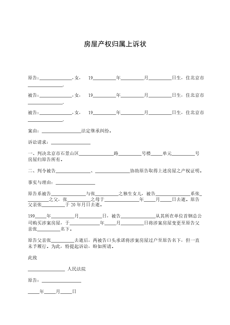 原告:______________,女,19__________年__________月__________日生,住北京市_______________. 被告:______________,女,19__________年__________月__________日生,住北京市_______________. 被告:______________,女,19__________年__________月__________日生,住北京市_______________. 案由:_________________法定继承纠纷。 诉讼请求:_________________ 一、判决北京市石景山区_______________路__________号楼_____单元__________号房屋归原告所有。 二、判令被告_______________、_______________协助原告取得上述房屋之产权证明。 事实与理由:_________________ 原告系被告_______________与张__________之独生女儿,被告_______________系张__________之父,张__________之母于_______________年_____月_____日去逝。原告父亲张__________于20_____年_____月_____日去逝。 199_____年__________月__________日,被告_______________从其所在单位首钢总公司购买涉案房屋,于_____________年_____月__________日将涉案房屋变更至原告父亲张__________名下。 原告父亲张__________去逝后,两被告口头承诺将涉案房屋过户至原告名下,但一直未予履行。为此,特提起诉讼,盼如所请。 此致 ________________ 人民法院 原告:_________________ _____年_____月_____日