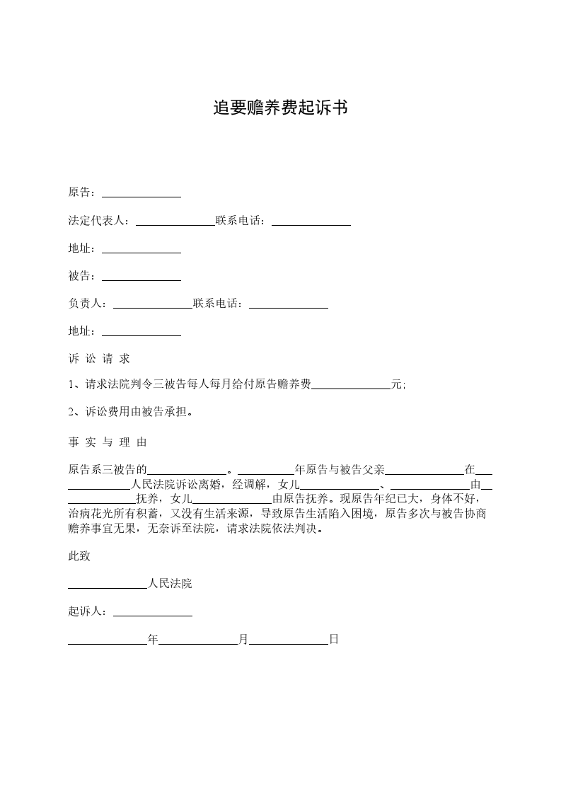 原告:______________ 法定代表人:______________联系电话:______________ 地址:______________ 被告:______________ 负责人:______________联系电话:______________ 地址:______________ 诉 讼 请 求 1、请求法院判令三被告每人每月给付原告赡养费______________元; 2、诉讼费用由被告承担。 事 实 与 理 由 原告系三被告的______________。__________年原告与被告父亲______________在______________人民法院诉讼离婚,经调解,女儿______________、______________由______________抚养,女儿______________由原告抚养。现原告年纪已大,身体不好,治病花光所有积蓄,又没有生活来源,导致原告生活陷入困境,原告多次与被告协商赡养事宜无果,无奈诉至法院,请求法院依法判决。 此致 ______________人民法院 起诉人:______________ ______________年______________月______________日
