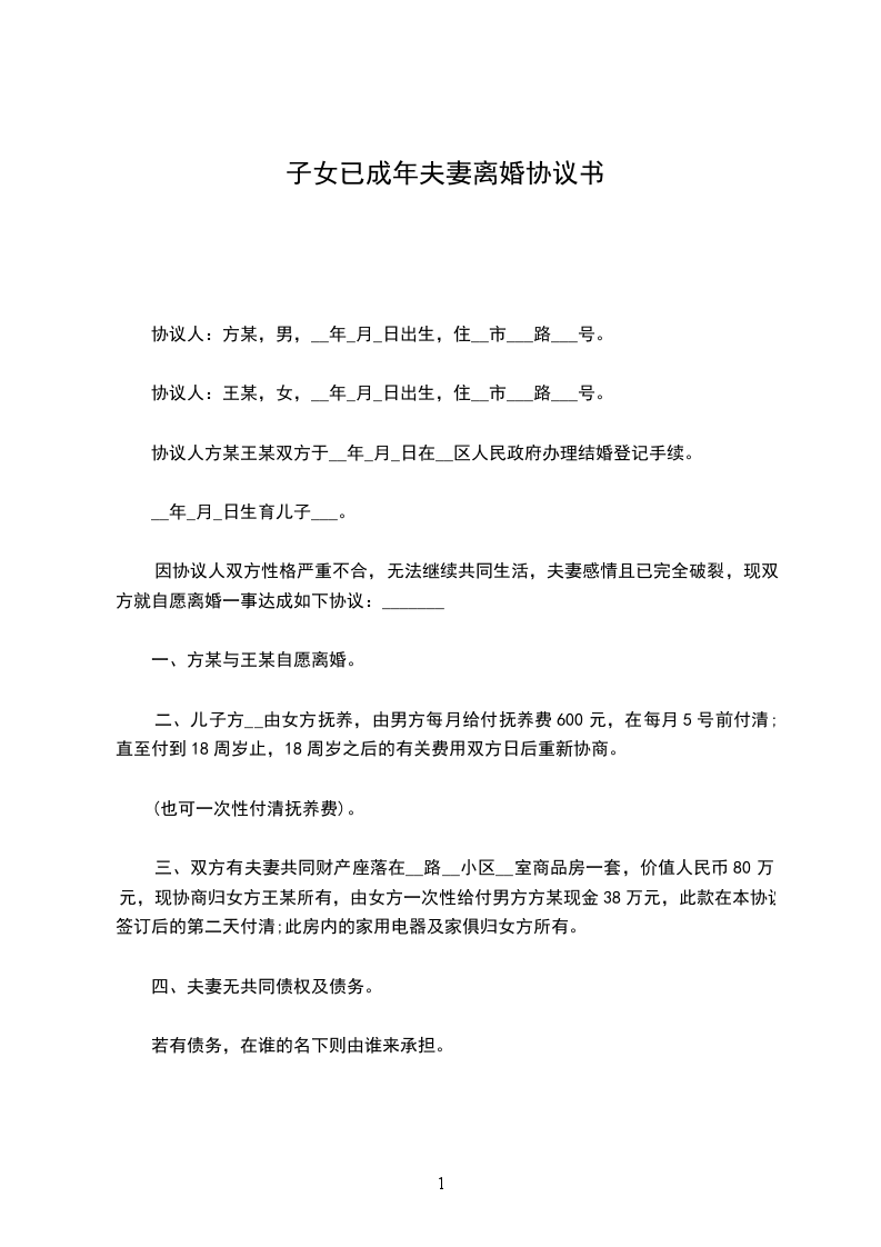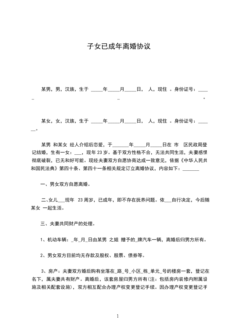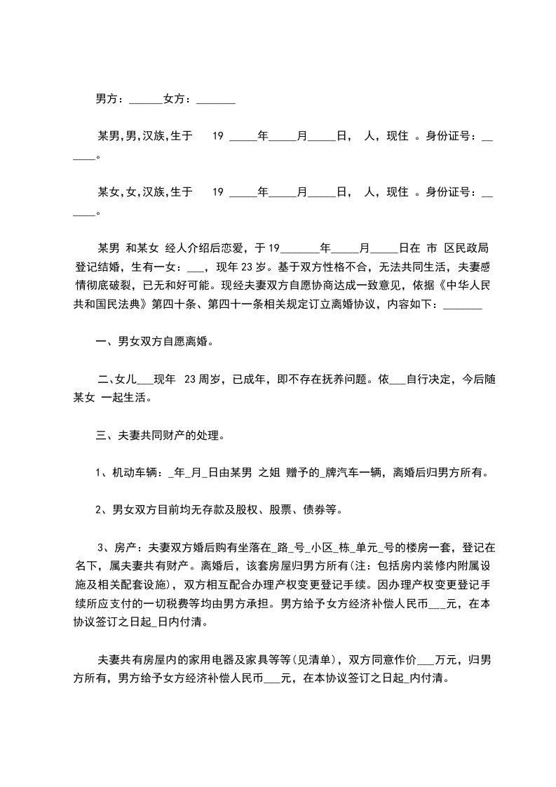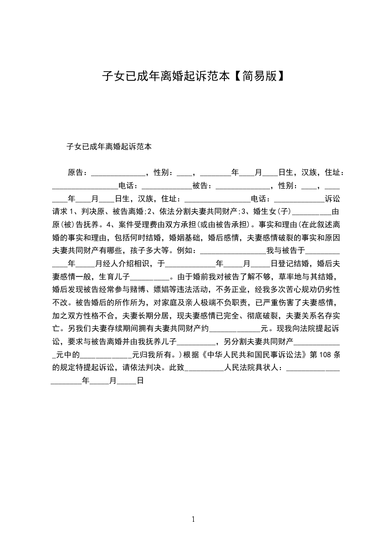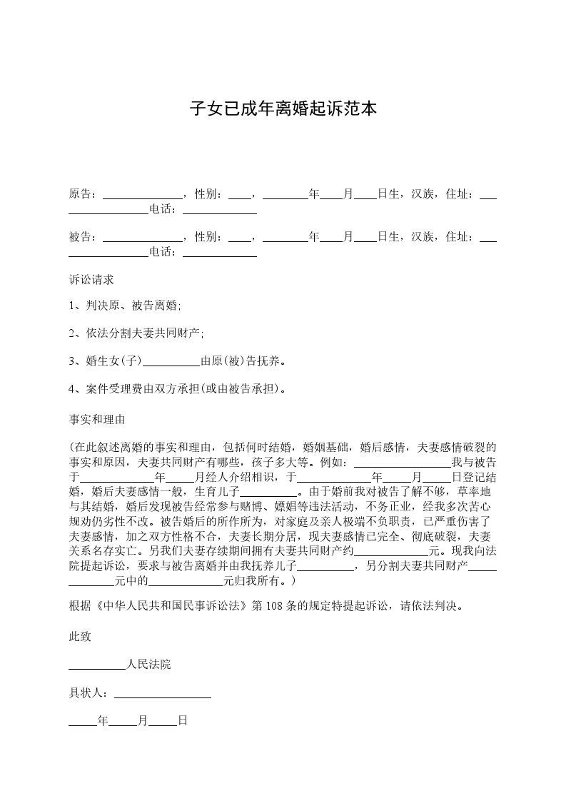 原告:______________,性别:____,________年____月____日生,汉族,住址:_________________电话:_____________ 被告:______________,性别:____,________年____月____日生,汉族,住址:_________________电话:_____________ 诉讼请求 1、判决原、被告离婚; 2、依法分割夫妻共同财产; 3、婚生女(子)__________由原(被)告抚养。 4、案件受理费由双方承担(或由被告承担)。 事实和理由 (在此叙述离婚的事实和理由,包括何时结婚,婚姻基础,婚后感情,夫妻感情破裂的事实和原因,夫妻共同财产有哪些,孩子多大等。例如:_________________我与被告于_____________年_____月经人介绍相识,于_____________年_____月_____日登记结婚,婚后夫妻感情一般,生育儿子__________。由于婚前我对被告了解不够,草率地与其结婚,婚后发现被告经常参与赌博、嫖娼等违法活动,不务正业,经我多次苦心规劝仍劣性不改。被告婚后的所作所为,对家庭及亲人极端不负职责,已严重伤害了夫妻感情,加之双方性格不合,夫妻长期分居,现夫妻感情已完全、彻底破裂,夫妻关系名存实亡。另我们夫妻存续期间拥有夫妻共同财产约_____________元。现我向法院提起诉讼,要求与被告离婚并由我抚养儿子__________,另分割夫妻共同财产_____________元中的_____________元归我所有。) 根据《中华人民共和国民事诉讼法》第108条的规定特提起诉讼,请依法判决。 此致 __________人民法院 具状人:_________________ _____年_____月_____日